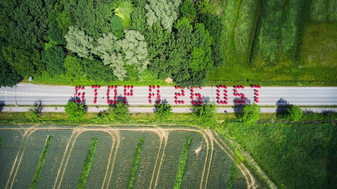 Mit 105 roten Regenschirmen haben vergangenen Sonntag 120 Gegner der geplanten Autobahn A26-Ost ihren Widerstand zum Ausdruck gebracht. Mit den Regenschirmen in der Hand wurde der 84 Meter lange Schriftzug: „Stop A26-Ost“ auf die Straße Kornweide in Wilhelmsburg gebracht. Das Bildmaterial aus der Drohnen-Perspektive soll den Widerstand gegen den an dieser Stelle geplanten Bau einer Stadtautobahn mitten durch Wilhelmsburg verdeutlichen. Anlass der Protestaktion ist die derzeit laufende Planfeststellung für die auch „Hafenpassage“ genannte A26-Ost, die durch die Kirchdorfer Wohngebiete verlaufen soll (der Neue RUF berichtete). Die Aktion war Teil der bundesweiten Kampagne für eine Mobilitätswende mit der zentralen Forderung eines Moratoriums für den Neubau neuer Autobahnen.