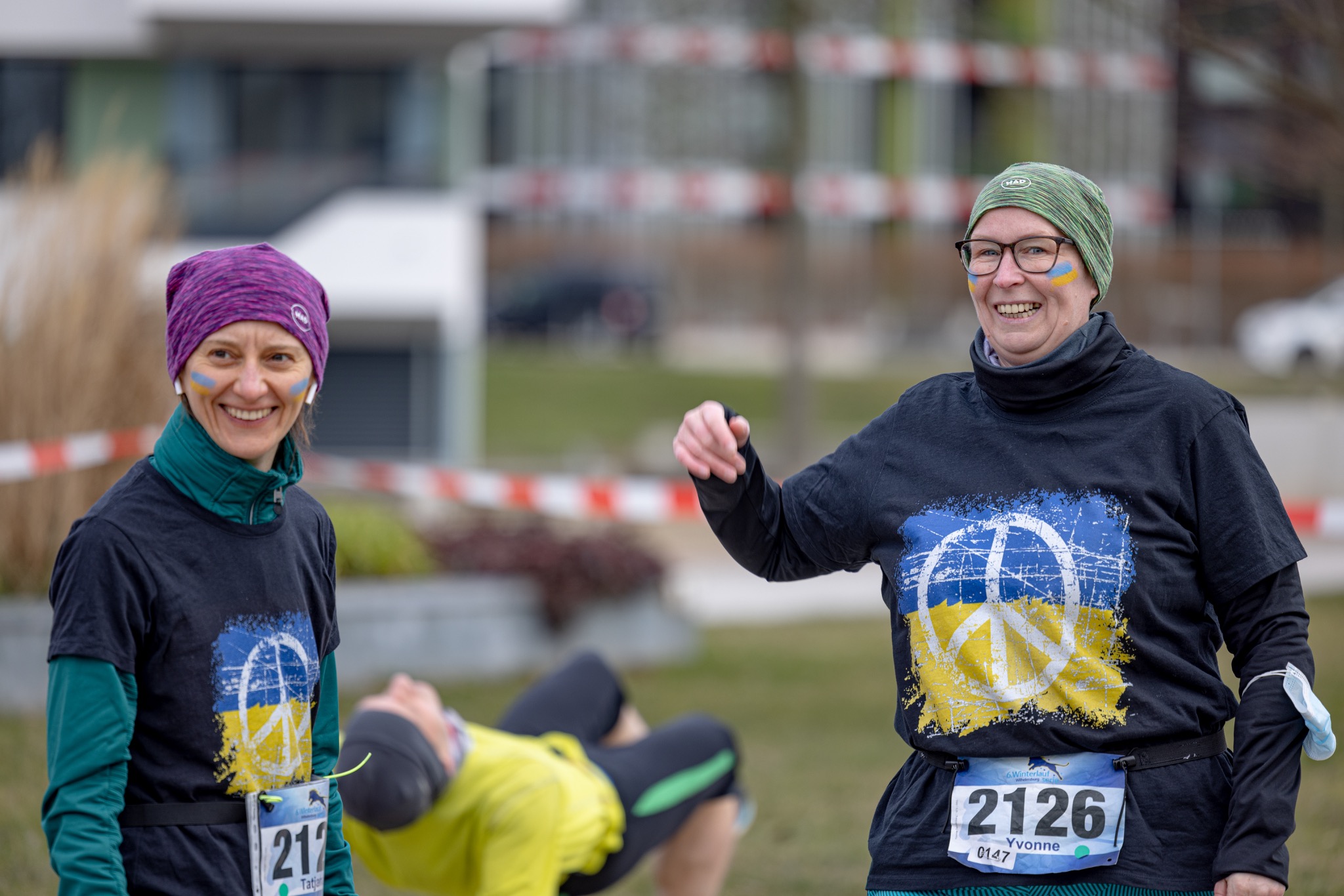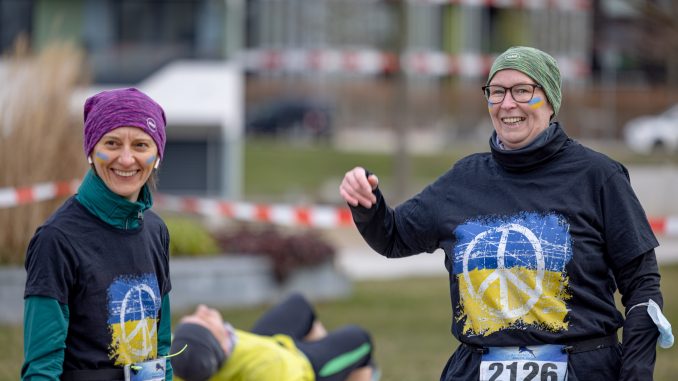 Das eigentliche Hauptthema des finalen Laufs war gefühlt aber ein anderes. Schaute man sich die Laufkleidung der Teilnehmenden an, so stach die Farbkombination blau-gelb auffällig oft hervor. Bereits im Vorfeld wurde der letzte Termin zu einem Solidaritätslauf der Ukraine ausgerufen. Mit Gesichtsfarbe über farblich abgestimmte Laufausrüstung zu Shirts mit Peace-Symbolen drückten die Läuferinnen und Läufer ihre Anteilnahme aus. Und im Hintergrund wehte neben den Fahnen Wilhelmsburg auch eine Flagge der Ukraine.