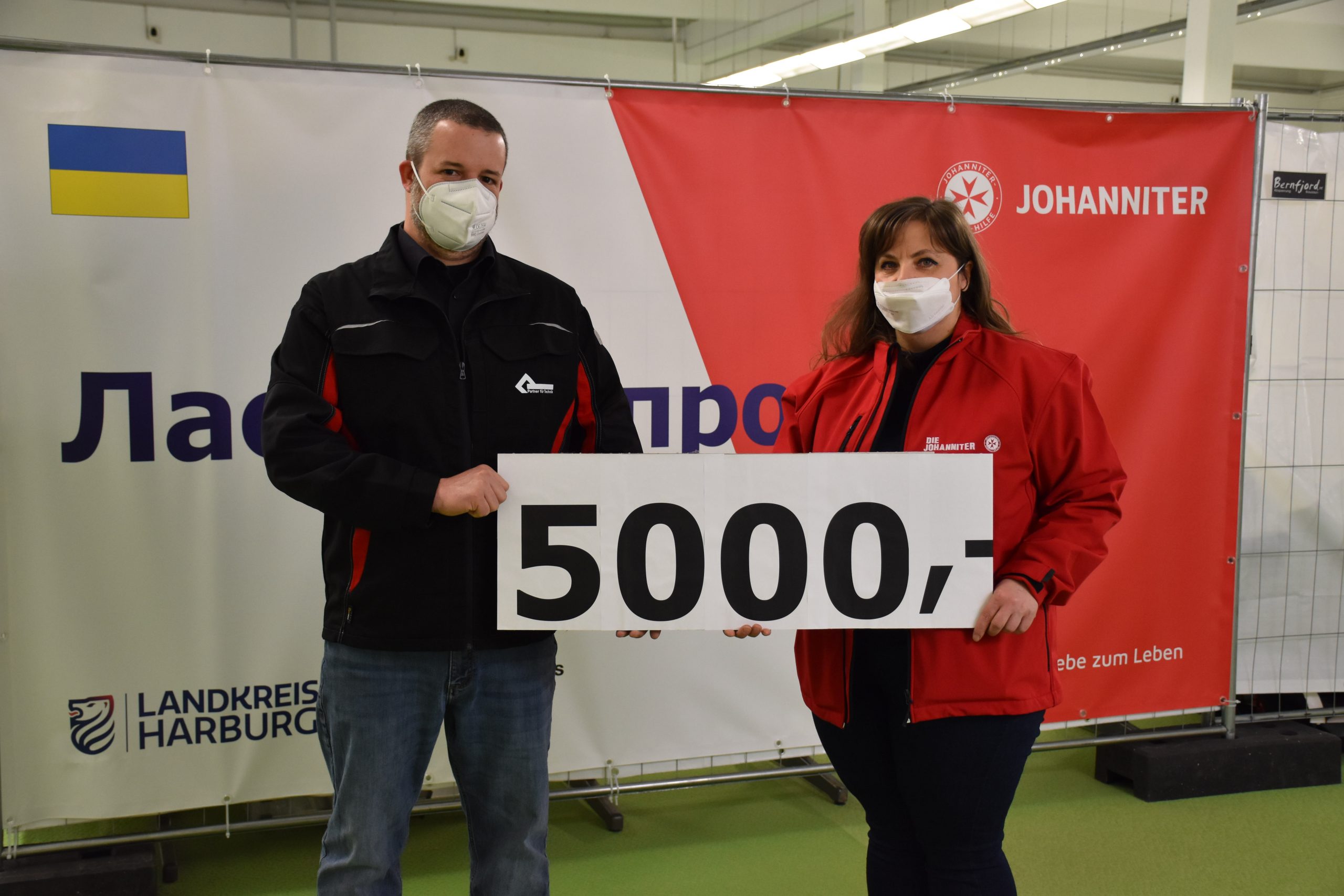 Foto: Johanniter -Heiko Grubert von der Rudolf Sievers GmbH überreichte Iryna Okay von den Johannitern symbolisch 5.000 Euro für die Notunterkunft im Helbach-Haus