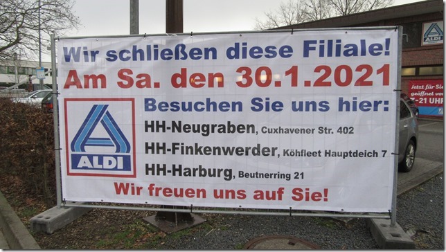 Die ALDI-Filiale im Striepenweg 37 in Hausbruch wird zum 30. Januar gegen 21 Uhr wegen Abriss und Neubau geschlossen. Dies bestätigte auf RUF-Nachfrage Regionalverkaufsleiter Florian Fiedler. Weil die Baugenehmigung für den neuen ALDI-Markt an gleicher Stelle schnell erteilt worden sei, habe man relativ kurzfristig entschieden, schon am 30. Januar zu schließen. Danach würde es rund eine Woche dauern, bis das umfangreiche Sortiment der Filiale ausgeräumt sei. Dann würden die Abrissbagger anrücken, erläuterte Fiedler. Auf einen genauen Termin zur Neueröffnung der Filiale am Standort Striepenweg wollte sich Fiedler nicht festlegen. Wahrscheinlich zum Jahresende 2021 könnten die Kunden in Hausbruch wieder bei ALDI shoppen gehen, so Fiedler. Bis dahin müssen die Kunden – wie es auf den Info-Tafeln steht – mit den ALDI-Filialen in Harburg, Neugraben oder Finkenwerder vorlieb nehmen.