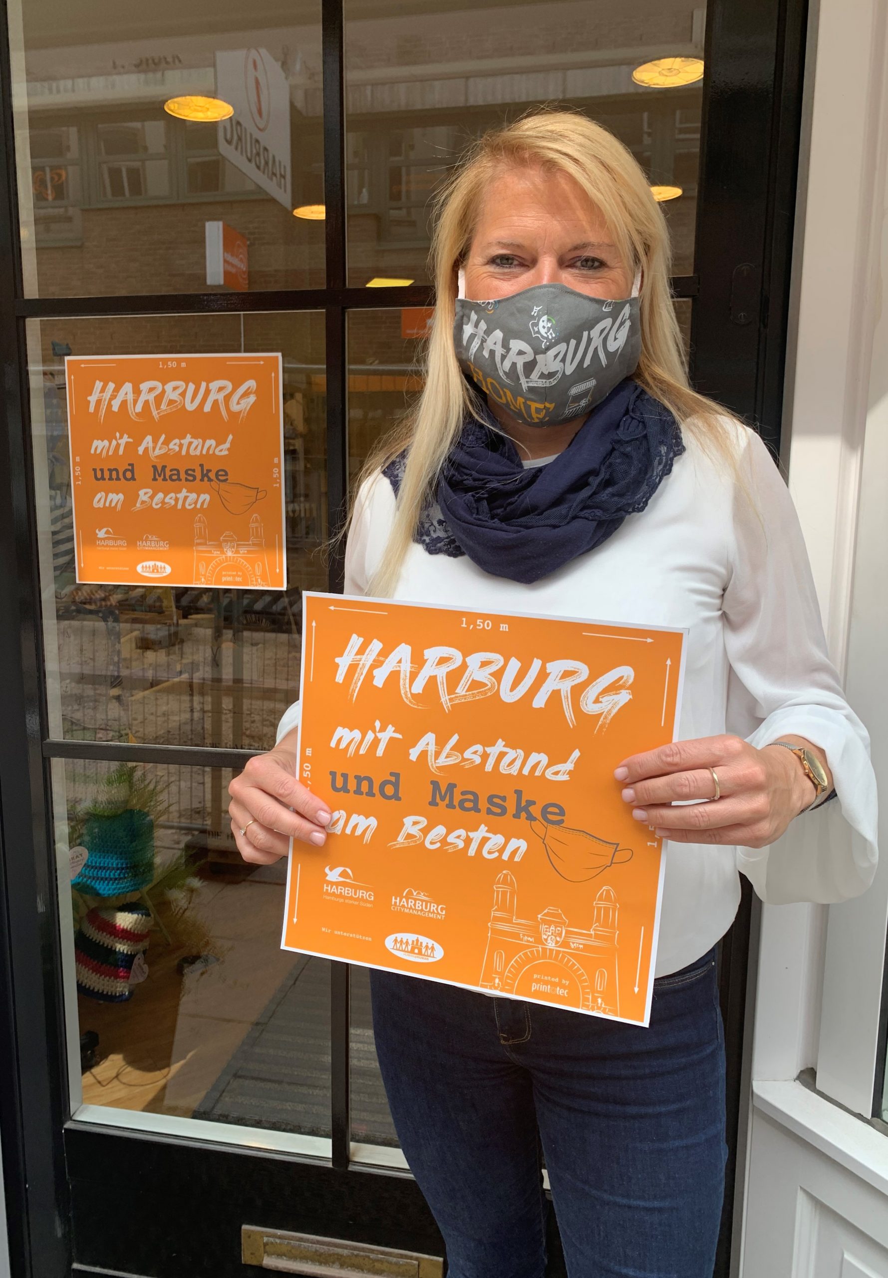Citymanagement Harburg -Melanie-Gitte Lansmann stellte Maske und Aufkleber vor
