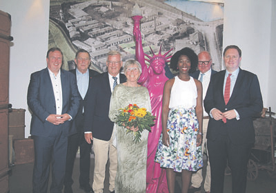 Sie freuen sich über das 10-Jährige Jubiläum der BallinStadt: Volker Reimers (BallinStadt), Gert Hinnerk Behlmer (Beirat der BallinStadt), Wolfgang Wietbrok (Freundeskreis Auswandererwelt BallinStadt e.V.), Margarete Pauschert (Kofferstifterin), Dayan Kodua (Schauspielerin), Jens Nitschke (BallinStadt), Dr. Carsten Brosda (Senator für Kultur und Medien).Foto: au