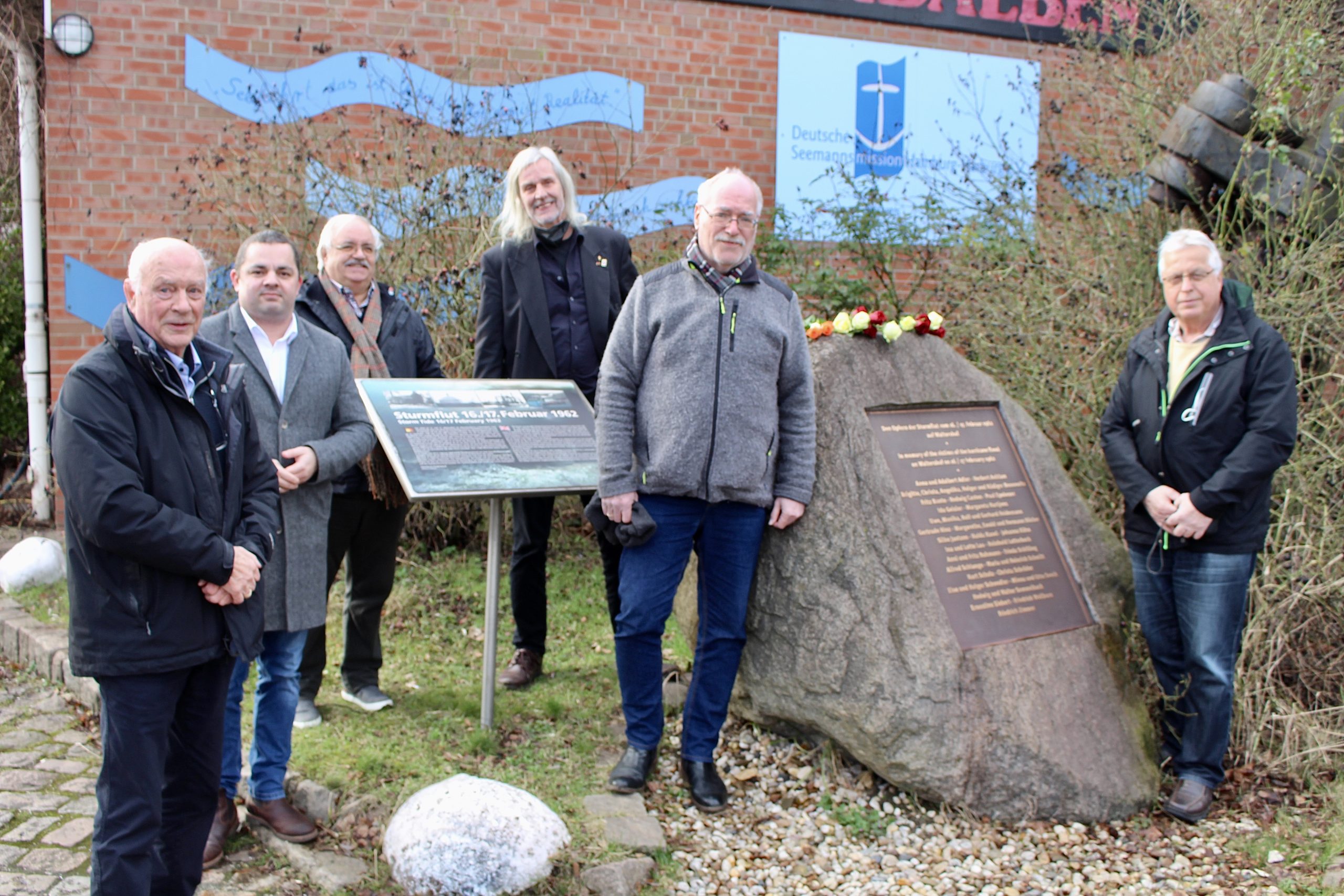 Foto: pm -Johannes Tönnies Ralf Neubauer Detlef Baade Jan Oltmanns und Dieter Steuernagel sowie Rolf Ulakowski (v.l.) legten Blumen am Gedenkstein nieder