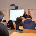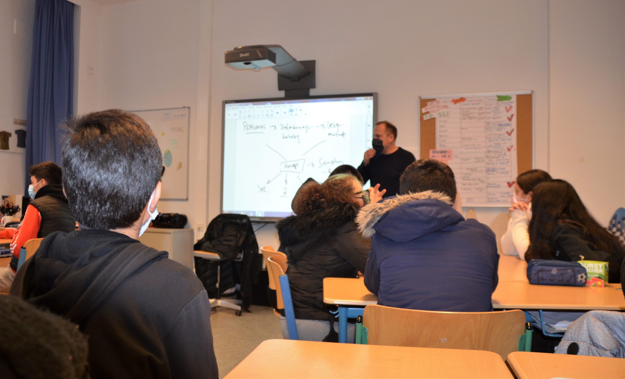 Am Activboard zeichnet Marc Finsterlin Pfeile zwischen den Begriffen Zielgruppe, Anforderungskriterien, Zeitplan, Resourcenplanung. Dann wendet er sich den Schülerinnen und Schülern wieder zu. „Wie bekommt ihr raus, was so eine Longboardtasche alles können muss?“ Einige Finger gehen hoch. „Ich würde zur Skaterbahn gehen und eine Umfrage bei den Skatern machen.“ Finsterlin zieht die Mundwinkel nach oben und nickt. „Genauso hatten wir es auch mit unseren Taschen gemacht. Richtig.“