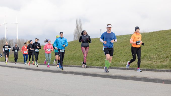 Auf diesen Moment musste die Organisatoren und viele Teilnehmerinnen und Teilnehmer des Wilhelmsburger Insellaufes rund zwei Jahre warten. Am vergangenen Sonntag feierte das Laufereignis mit den Strecken Halbmarathon, 10 km, 5 km und Schülerlauf sein Comeback auf der Straße. Endlich wieder gemeinsam laufen und nicht nur virtuell oder digital mitmachen, wie es aufgrund der Corona-Pandemie 2021 der Fall gewesen ist. Dass das Wetter bei der 41. Auflage erst einmal nur bedingt für Frühlingsgefühle sorgte, weil hin und wieder Schneeflocken fielen und eine hellgraue Wolkendecke kaum einmal wärmende Sonnenstrahlen zuließ, minderte die Vorfreude der Läuferinnen und Läufer dennoch nicht. Moderator Karsten Schölermann verwies zwar vor dem Start des Halbmarathons noch darauf, „dass die Räumfahrzeuge unterwegs waren und die Strecke am Deich von Schneewehen befreit und präpariert ist“, aber das war freilich nur ein Scherz.