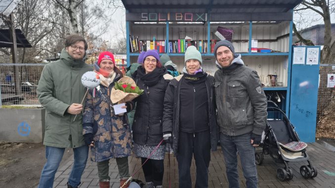 Die Tauschkiste in Wilhelmsburg, genannt Solibox, ist die erste von der Stadt errichtete und genehmigte Einrichtung ihrer Art und steht seit gut vier Jahren vor den Zinnwerken e.V., Am Veringhof 7 (der Neue RUF berichtete). Seit zwei Jahren nun gibt es eine besonders gute Seele an der Solibox: Esma Jakupi betreut mit jeder Menge ehrenamtlichem Engagement die Ordnung und Sauberkeit an der Box. Die Wilhelmsburgerin verbringt viel Zeit an der Box und ist ein wichtiger Teil des Projekts geworden. Auch um die Box herum sorgte Esma durch Bepflanzung des Grundstücks für eine Verschönerung der Umgebung. Die Organisatoren der Box haben sich im Rahmen des Wintermarkts der Zinnwerke am Nikolaustag bei Esma für ihr Engagement bedankt. Am Tag zuvor hatten sie schon die Aktiven vom Kultur Kanal e.V. gewürdigt und der Solibox eine solarbetriebe Beleuchtung geschenkt. Janwillem van de Loo vom Solibox Orga-Team dankte dafür und würdigte sie: „Esma, du vor Ort und wir vom Orga-Team im Kontakt mit der Verwaltung – das ist ein Dream Team! Ohne dich würde es nicht gehen, wir danken dir von Herzen“.