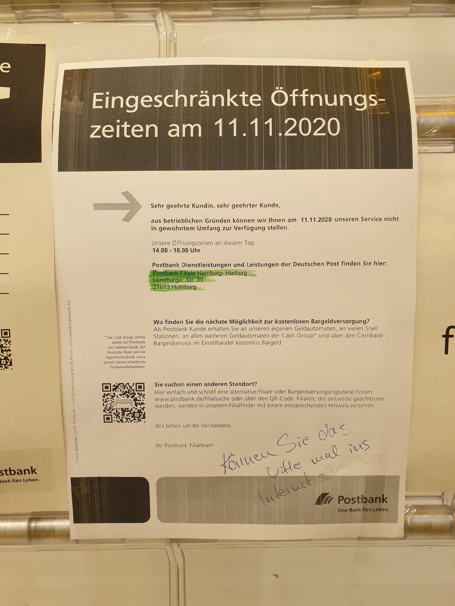 „Leider ist die personelle Situation in Hamburg-Wilhelmsburg aufgrund von Personalausfällen aktuell sehr angespannt. Diese kurzfristig – zum Beispiel durch Krankmeldungen – bekannt werdenden Personalausfälle können oft durch Maßnahmen in der Personalplanung aufgefangen werden. Dies gelingt nicht in allen Fällen, daher konnten wir in den ersten Novembertagen die Filiale nicht immer regulär öffnen. Eine Prognose für die kommenden Tage kann ich zum jetzigen Zeitpunkt leider nicht abgeben“, erklärt Oliver Rittmaier, zuständig für die Presse- und Öffentlichkeitsarbeit der Postbank. So setze man aber derzeit alles daran, vor Ort wieder mit verlässlichen Öffnungszeiten präsent zu sein. Doch damit nicht genug: Auch die beiden Geldautomaten der Postbank waren defekt, „mal eben schnell“ Geld abheben war nicht möglich. Seit vergangenem Donnerstag sind die beiden Automaten aber wieder in Betrieb. „Die Störung an den beiden Geldautomaten konnte kurzfristig beseitigt werden. Beide Geräte funktionieren wieder und können von den Kunden genutzt werden“, so Rittmaier.