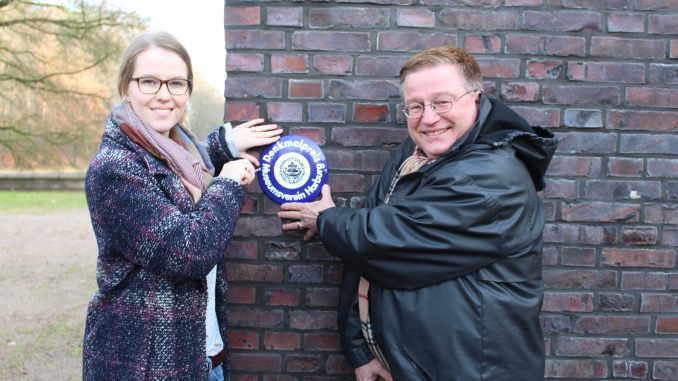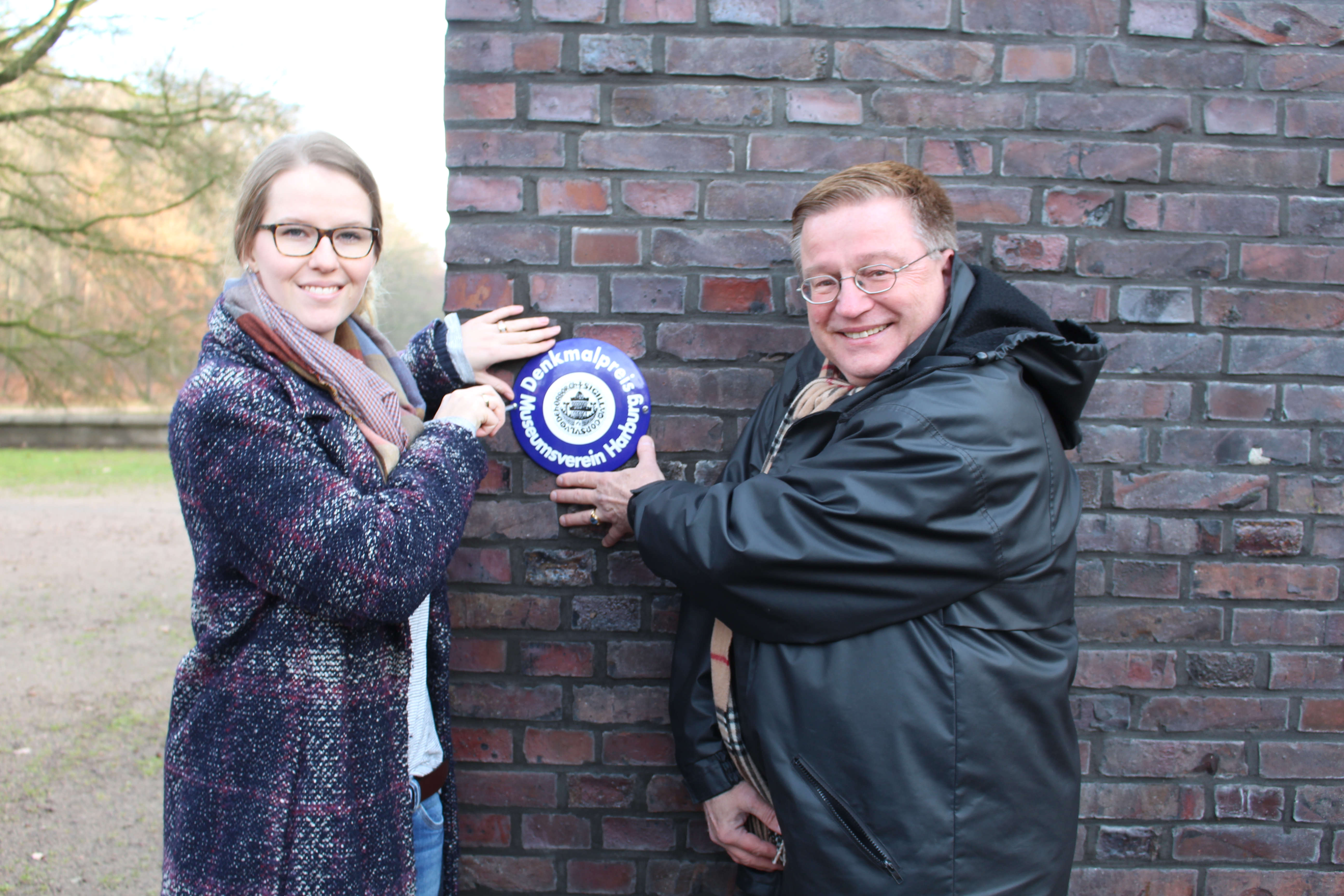 Der Verein will mit der Vergabe des Preises und der damit einhergehenden öffentlichen Wertschätzung künftige Bewerber animieren und motivieren, sich für den Erhalt und die Bewahrung ihrer Harburger Denkmäler aktiv einzusetzen. Der Denkmalpreis des Museumsvereins besteht aus einer Urkunde und einer runden Plakette, die deutlich sichtbar am Denkmal angebracht wurde: Viktoria Isabell Ehlers und Peter Hornberger griffen zum Schraubendreher und brachten, nachdem die Urkunden ausgehändigt wurden, die nicht zu übersehende weiß-blaue Plakette an.