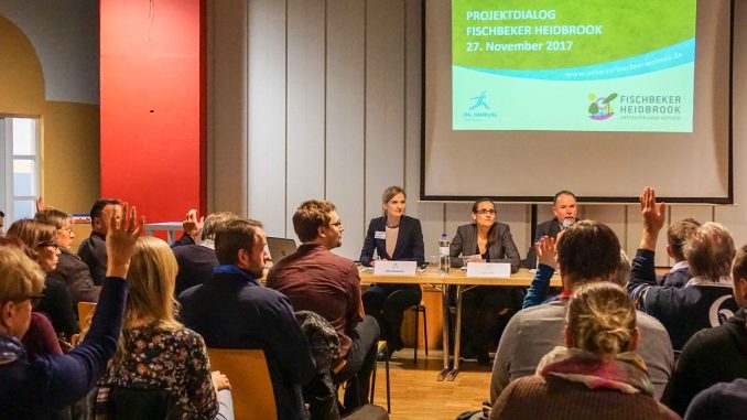 Darüber hinaus hält die IBA stets den Kontakt mit den Bürgern aufrecht. Rund 120 Personen kamen beispielsweise zum Projektdialog am 27. November in die Grundschule Ohrnsweg. In einem Jahresrückblick informierte Silke Schumacher von der IBA Hamburg zunächst über den aktuellen Planungsstand des Fischbeker Heidbrooks. Im Anschluss gab es Zeit für Nachfragen und Diskussion mit Karen Pein, Geschäftsführerin der IBA Hamburg GmbH und Jörg Penner, Baudezernent des Bezirksamtes Harburg. Insbesondere bei den Themen Kita, Schule, Infrastruktur und ÖPNV gab es viele Fragen und Gesprächsbedarfe. Anschließend nutzten Teilnehmer die Möglichkeit, sich zu persönlichen Anliegen oder Themenschwerpunkten mit den jeweiligen Ansprechpartnern der IBA Hamburg auszutauschen.