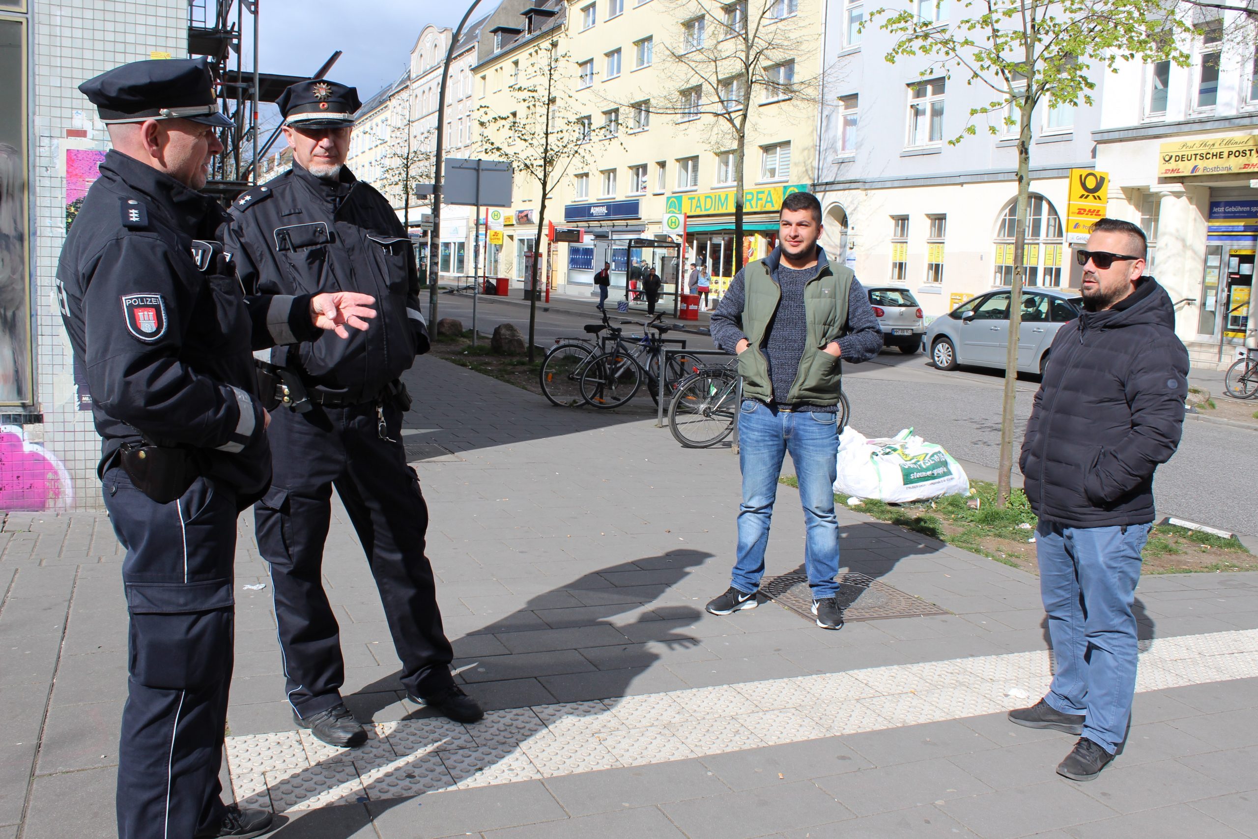 Geben gerne Auskunft: Die Stadtteilpolizisten Jörg Schlieker (links) und Maik Gelhaus im Gespräch mit zwei Wilhelmsburgern. Foto: au