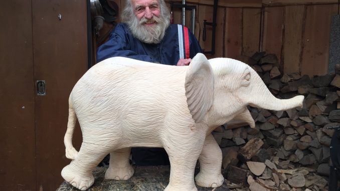 Unermüdlich schafft Eulenschnitzer Erich Gerer immer neue Werke aus seinem Lieblingsmaterial Holz. Sein jüngstes Werk ist ein Elefanten-Baby, das der Künstler in fünfwöchiger Arbeit das Licht der Welt erblicken ließ. Ideen habe er genug, den kleinen Elefanten habe er schon länger anfertigen wollen. Er habe es aber stets auf die lange Bank geschoben. Der hölzerne „Dumbo“ aus Weymouthskiefer (Seidenkiefer) misst 60 Zentimeter Höhe und 110 Zentimeter Länge. Gerer stellt die jüngste Arbeit bald in seinem Ausstellungsraum an der Cuxhavener Straße aus. Das Objekt steht zum Verkauf an.