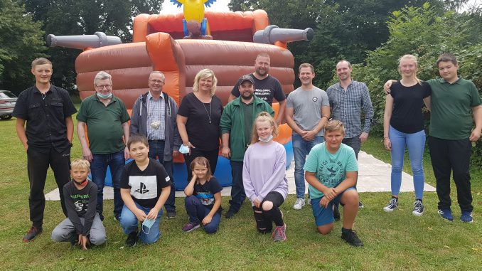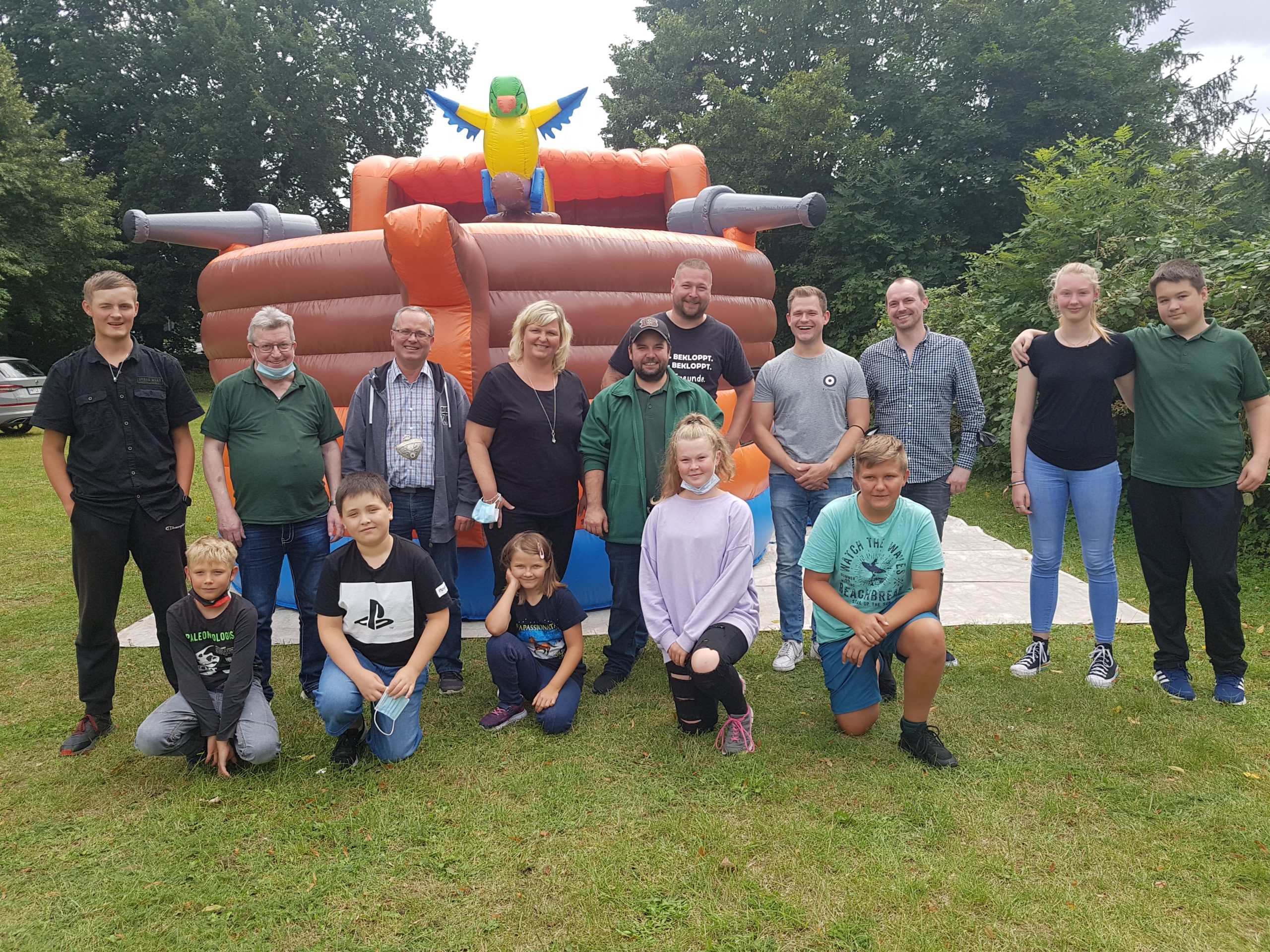 Frank Schwarz -Schützenkönig André Siebert Vizekönig Gerd Wittleben und Damenvizekönigin Nicole Kegel-Behr sowie Mitglieder des Festausschusses und einige Jungschützen vor der Hüpfburg