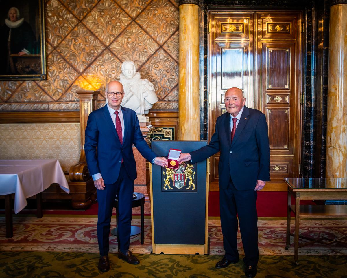Senatskanzlei Hamburg -Prof. Dr. Dr. h. c. Hermann Rauhe (re.) nimmt die Auszeichnung aus den Händen von Peter Tschentscher entgegen