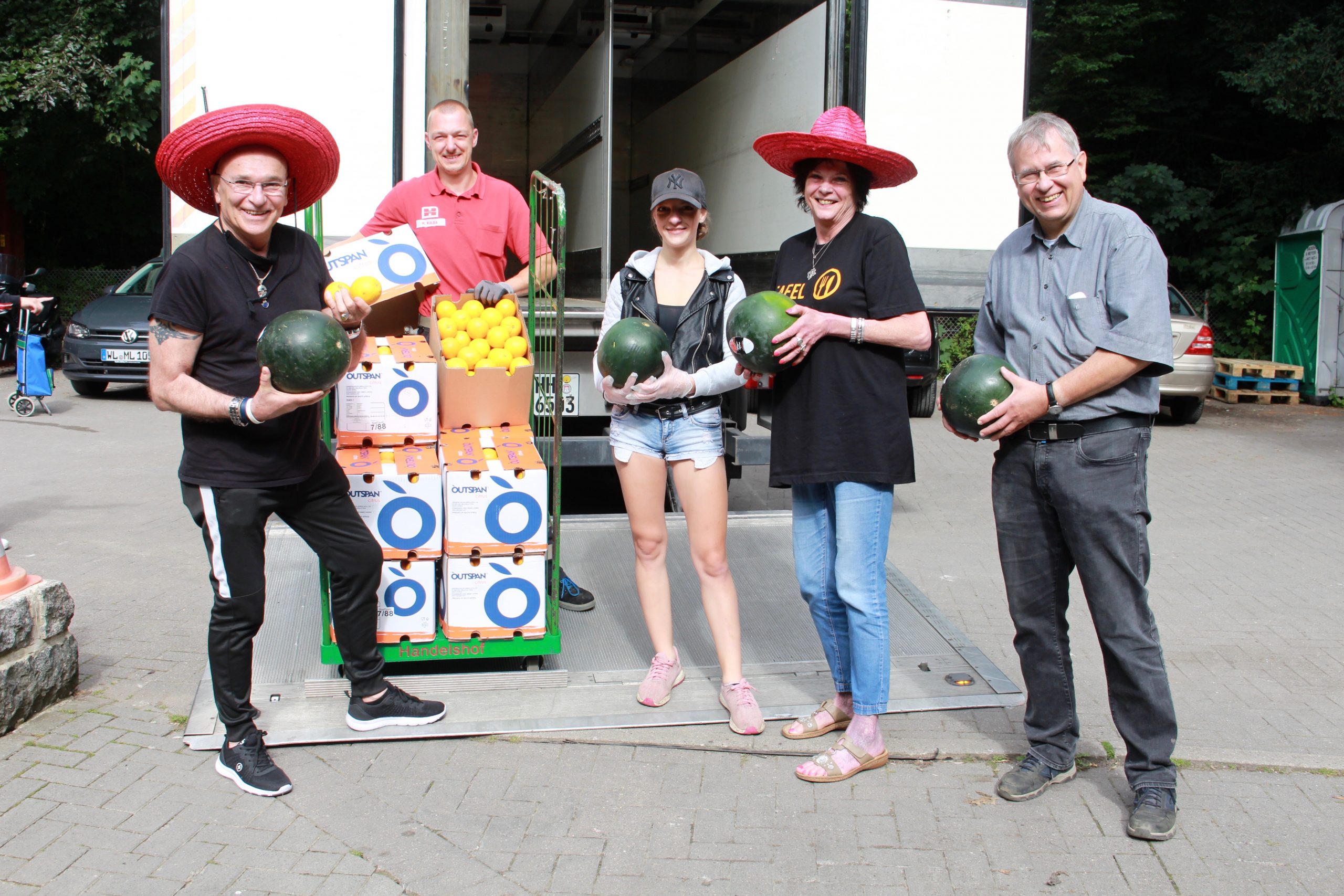 pm -Peter Sebastian der LKW-Fahrer Marco Kulba die freiwillige Helferin Melina aus Neugraben Carmen Wildeisen und Jens-Peter (Buchholz) beim Entladen des LKW