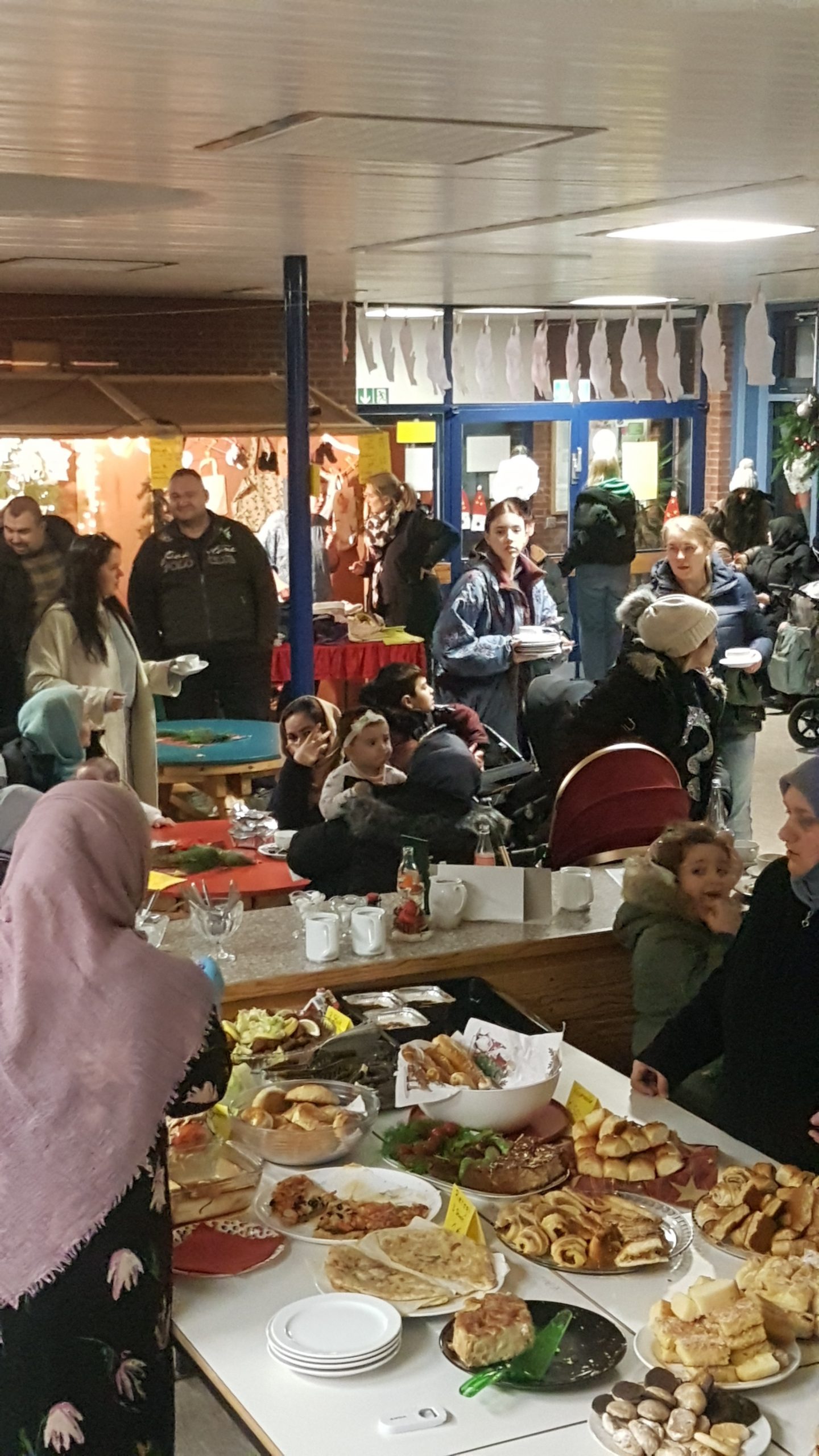 Auch kulinarisch ließ man sich nicht lumpen: Die Tische in der adventlich geschmückten Pausenhalle bogen sich unter den üppigen Platten mit Kuchen, Muffins, gebrannten Mandeln und kurdisch-türkischen und polnischen Köstlichkeiten.