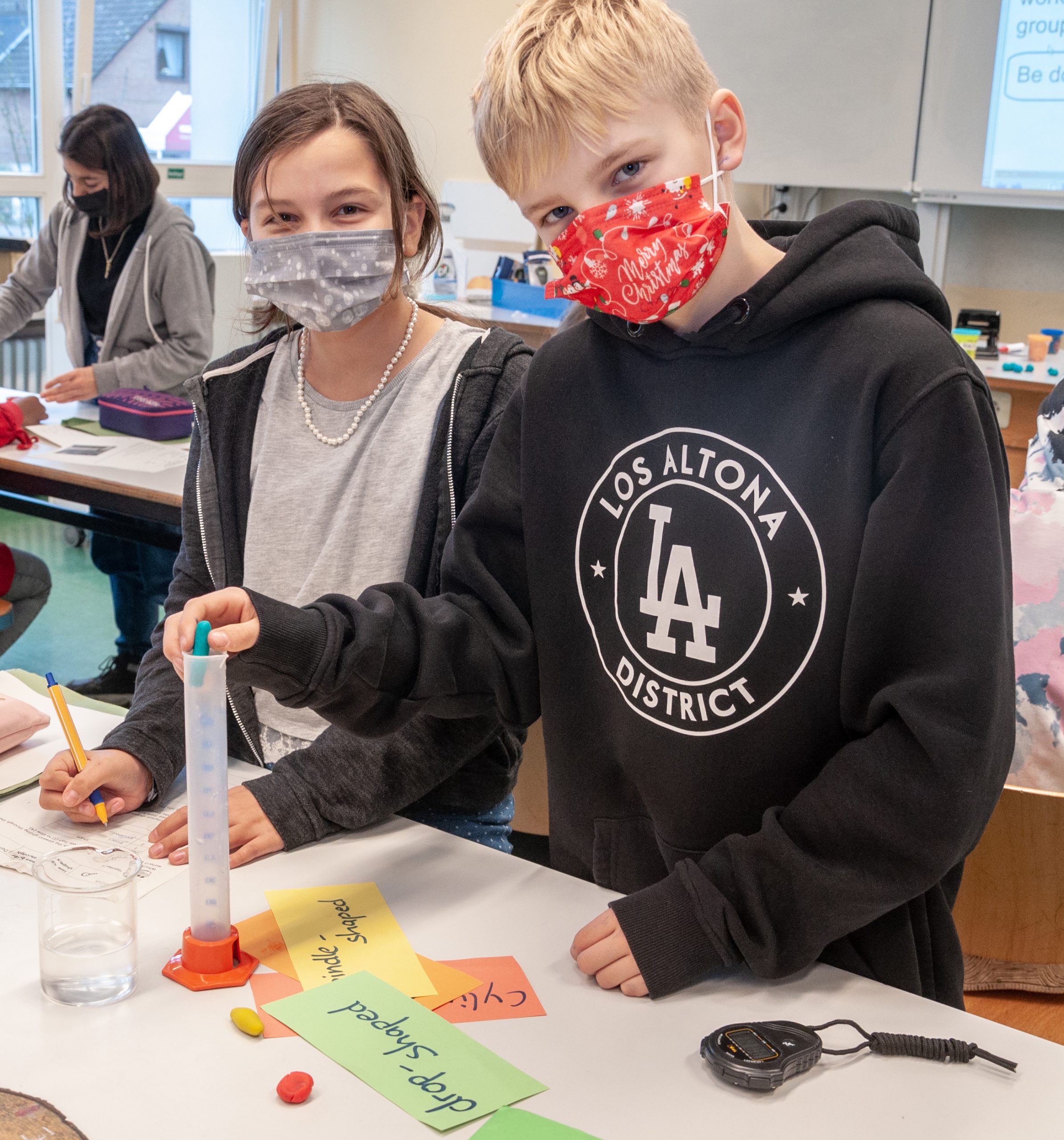 „Carla und Aiko aus der Immersionsklasse 6e untersuchen im „Science“-Unterricht die Sinkgeschwindigkeit verschiedener Körper“