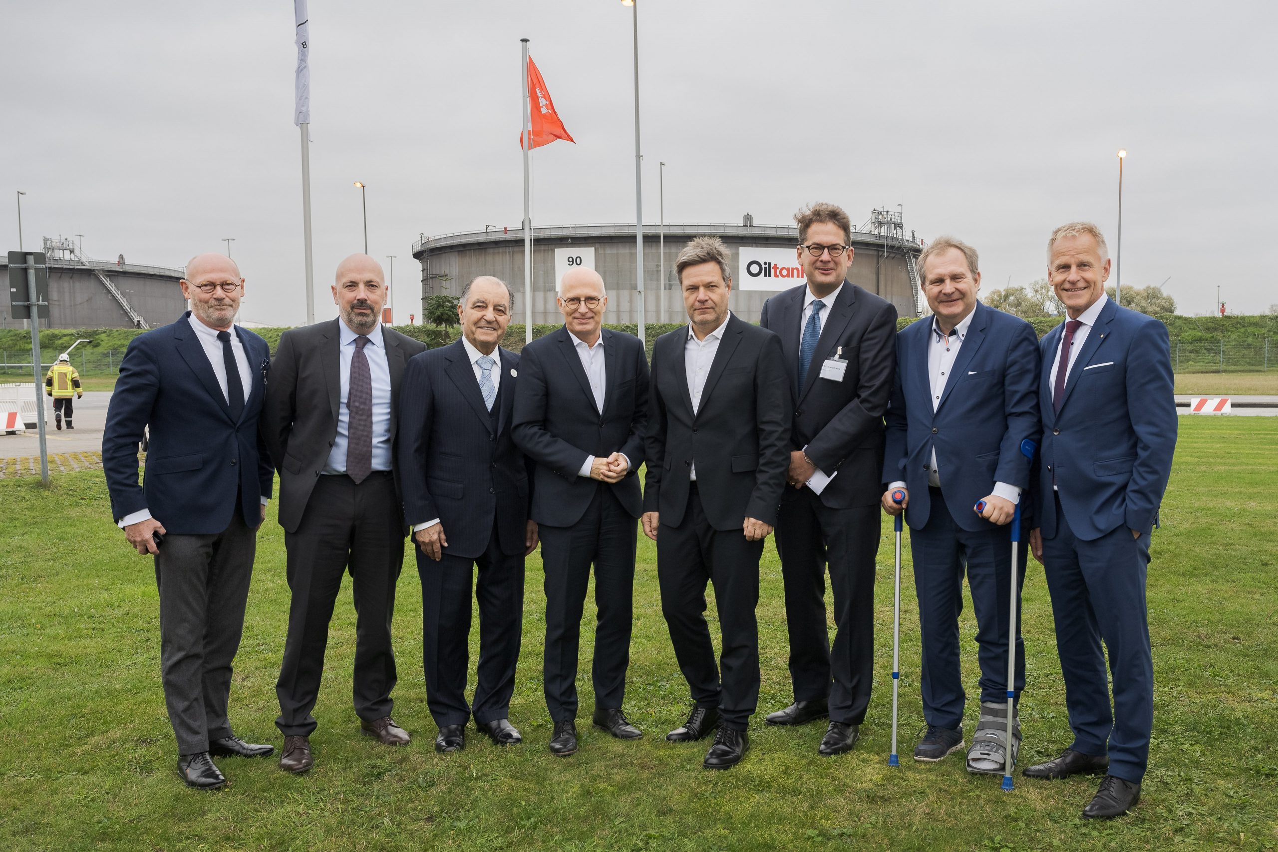 Stellten das Projekt im November 2022 gemeinsam vor: v.l.M. Westhagemann ehemaliger Wirtschaftssenator; J. Perkins Mabanaft; S. Ghasemi Air Products; Dr. Tschentscher Hamburgs Bürgermeister; Dr. Habeck Bundeswirtschaftsminister C. Witte M&B; J. Kerstan Umweltsenator; J. Meier HPA Foto: Mabanaft GmbH & Co KG