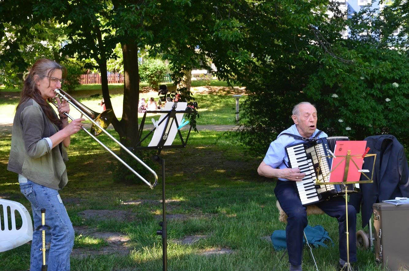 Gudrun Schmücker, Julia Kramer, Eva Meyer, Dietmar Wollbrück und Dirk Ziegler waren auch in Neuwiedenthal unterwegs, um den Bewohnern eine Abwechslung vom Alltag zu bescheren. Auch die Musiker hatten jede Menge Spaß mit ihrem Publikum. Im Wohnkomplex in der Neuwiedenthaler Straße 84 regnete es für das Duo Sally Mc Donnall vom Projekt „StoP- Stadtteile ohne Partnergewalt und Carmen Sylla sogar Blumen zum Dank. Josef Plakinger und Annette Faúndes Gerdts spielten in den Innenhöfen des Rehrstiegs für eine der Anwohnerinnen spontan ein Geburtstagsständchen und bekamen zum Abschied noch ein Glas Wasser von den Nachbarn spendiert. Auch Penelope Maimanakos und Giovanni Faúndes Gerdts vom Friedrich-Ebert-Gymnasium stellten sich dem Neuwiedenthaler Publikum. Sie waren sich einig: „Viele Menschen sind jetzt besonders einsam. Es hat Spaß gemacht, ihnen eine Freude zu bereiten.“