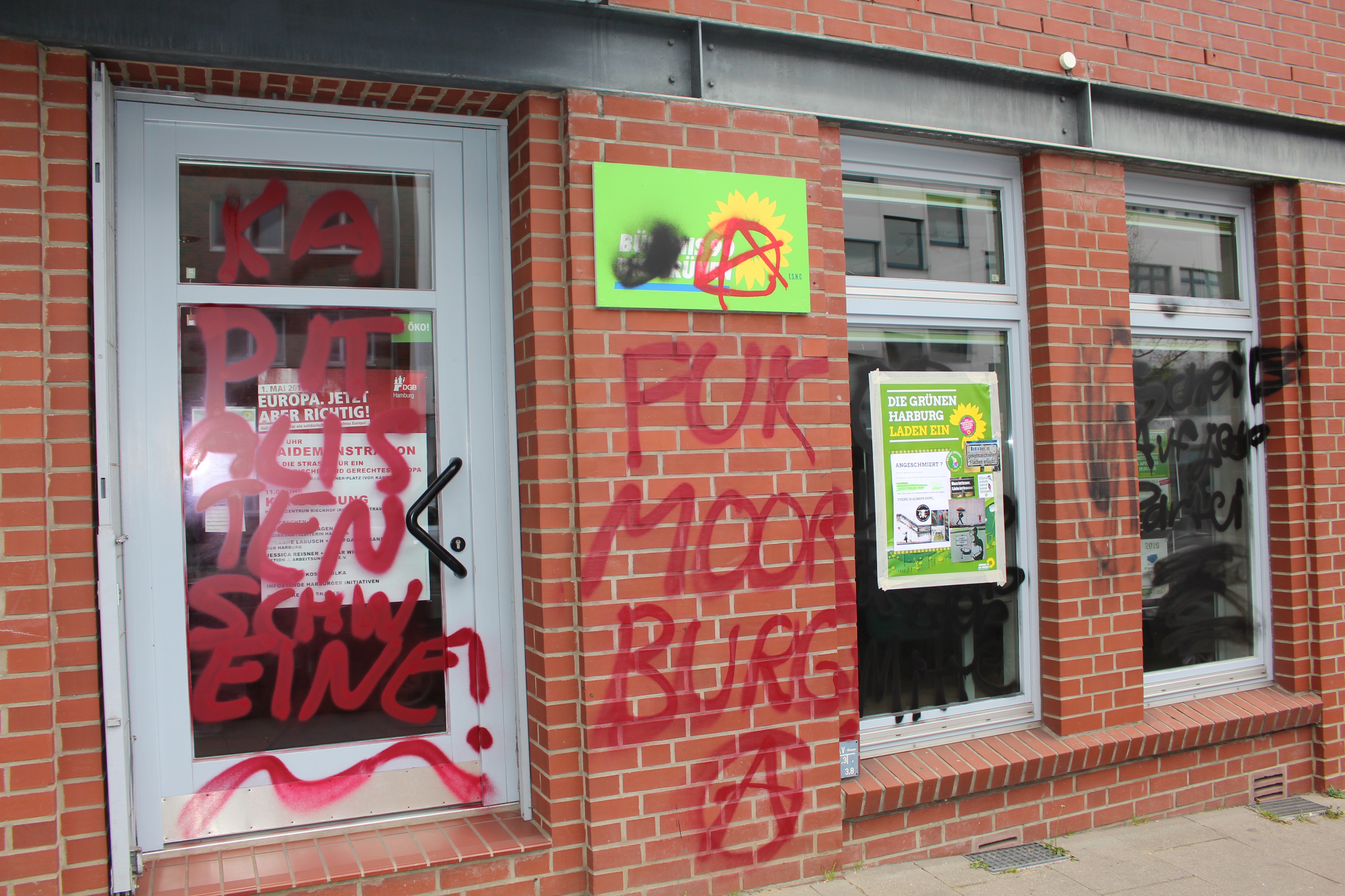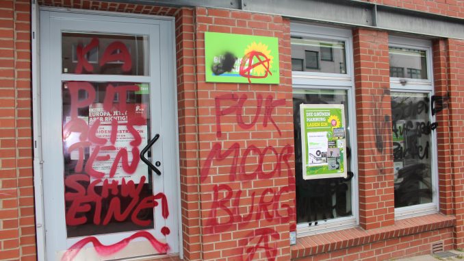 In der Nacht zum Ostersonntag wurden in Harburg gleich drei bezirkliche Fraktionsbüros Ziel eines Farbanschlages. Die Büros der Fraktion der Neuen Liberalen, Bündnis90/Die Grünen und Die Linke wurden mit politischen Parolen besprüht, die Fassaden somit verschandelt. Alle Fraktionen haben die Tat zur Anzeige gebracht, der Staatsschutz ermittelt. Betroffen ist auch das Büro der Fraktionsvorsitzenden der Linken in der Hamburgischen Bürgerschaft, Sabine Boeddinghaus . Sie unterhält in der Straße Wallgraben ihr Wahlkreisbüro.
