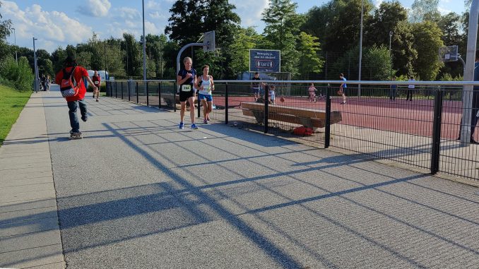 Die Ersten, die sich auf die Strecke machten, waren eine junge Truppe der Altersklasse U16. Allgemein war der Altersdurchschnitt an diesem Abend auffällig jung, lag dieser mit 38 Jahren deutlich unter der 40er Grenze, der sonst prägend für die hiesige Laufszene ist. Wenn man dann das Publikum im Inselpark noch dazuzählt, wird der Durchschnitt noch deutlich geringer gewesen sein. Die dortige Sportanlage mit Skatepark, Basketball- und Fußballfeld sowie Spielplätzen ist abends ein belebter Ort, wo sich viele Jugendliche aufhalten. Die Teilnehmenden wird’s nicht gestört haben, nimmt man die Partystimmung samt musikalischer Untermalung bei KM 2,5 gerne mit auf den Zielspurt.