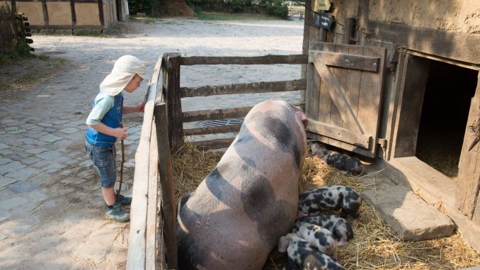 Das bsondere Erlebnis für Stadtkinder: Eine Bentheimer Sau säugt ihren Nachwuchs