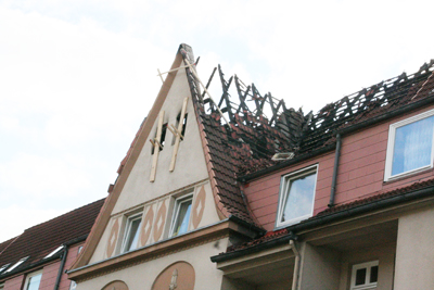 (pm) Harburg. Feuer, Menschenleben in Gefahr: Diese Meldung ging am 31. März an die Feuerwehr als ein Haus am Kroosweg 26 in Flammen stand. Als die Feuerwehr eintraf brannte der Dachstuhl eines viergeschossigen Wohngebäudes. Das Feuer war teilweise schon über den Giebel in die benachbarten Gebäude Hausnummer 24 und 28 übergelaufen. Eine Person wurde über eine tragbare Leiter aus dem 4. Obergeschoss gerettet. Diese und eine weitere Person wurden mit leichten Rauchgasvergiftungen in Krankenhäuser befördert. Das Feuer wurde mit 3 C-Rohren gelöscht. Mehrere Wohnungen im Haus Nr. 26 waren anschließend unbewohnbar. Im Einsatz waren waren 50 Kräfte der Berufs- und Freiwilligen Feuerwehr sowie des Rettungsdienstes von Feuerwehr und DRK.