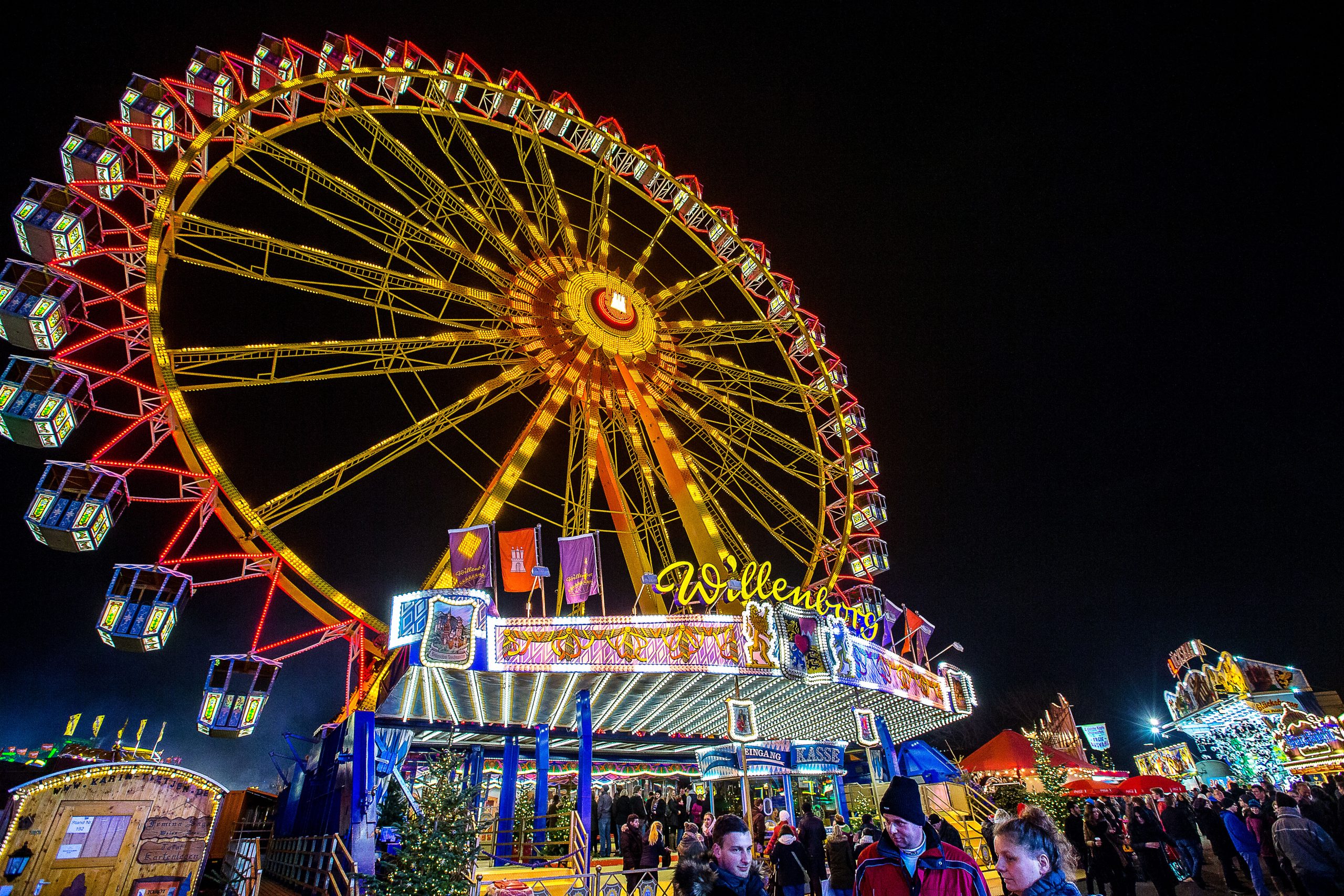 Hamburger Winterdom 2014, Dom, Kirmes, jahrmarkt, Rummel, Nachtaufnahme, Nacht, nachts, Beleuchtung, Fahrgeschaeft, Fahrgeschaefte, Riesenrad, Riesenraeder, Willenborg, *** Local Caption *** copyright: