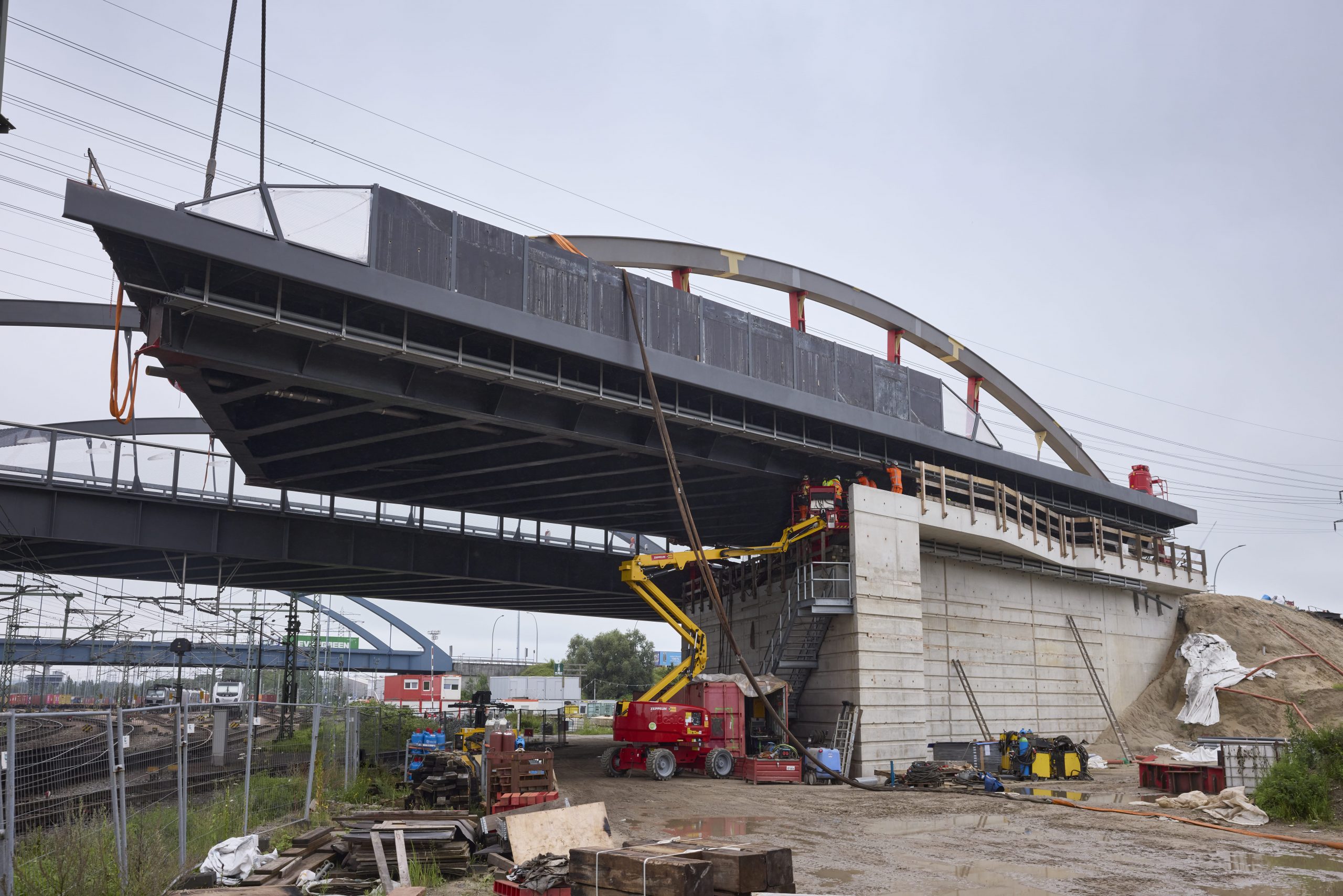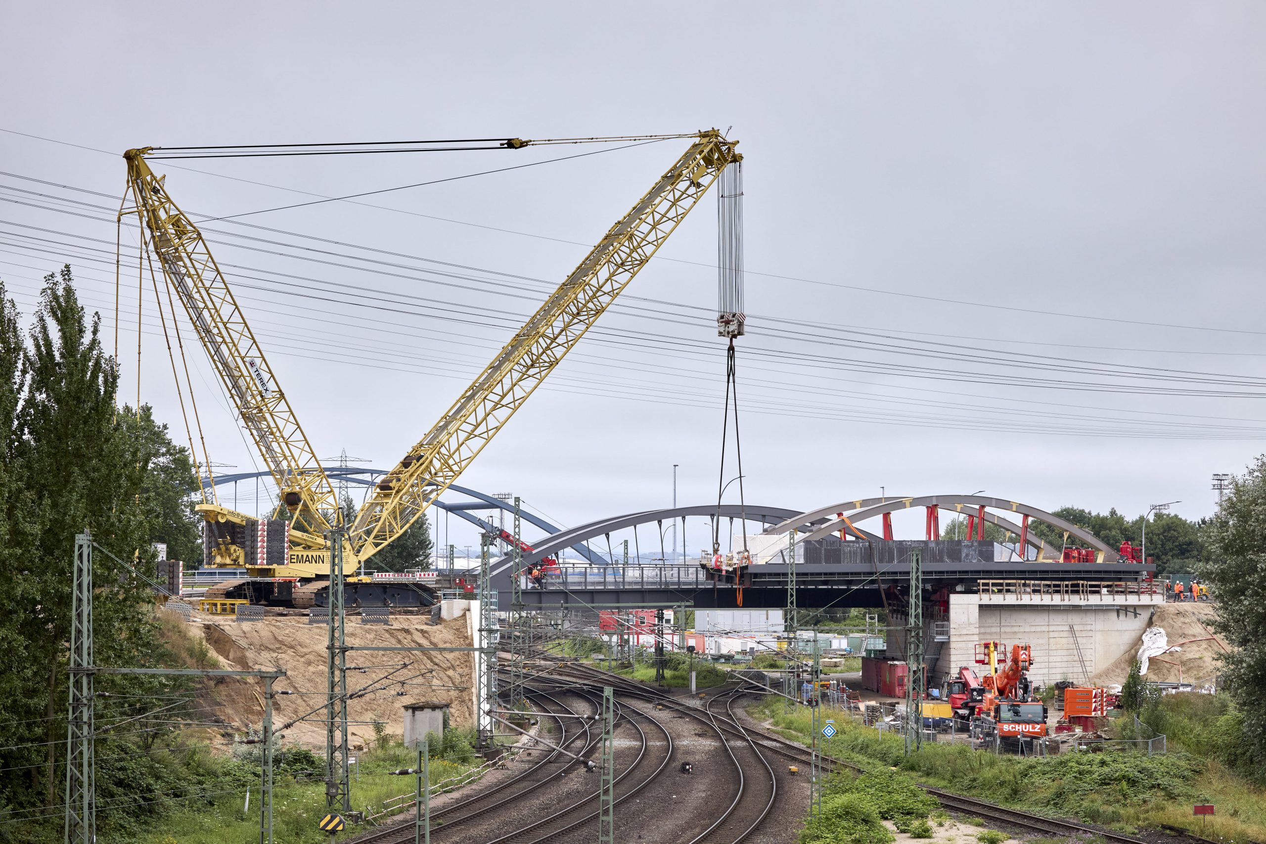 Der Einschub der rund 50 Meter langen, 18 Meter breiten und etwa 8 Meter hohen Stabbogenbrücke aus Stahl erfolgte im Schutz einer 24-stündigen Gleissperrpause von Samstagmorgen bis Sonntagmorgen. Die Brücke bringt ein Gewicht von ca. 500 Tonnen auf die Waage und wurde mithilfe mehrerer Plattformwagen (SPMT), eines Litzenhubsystems sowie eines 800-Tonnen-Raupenkrans millimetergenau positioniert.