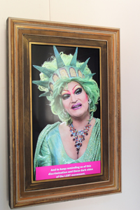 Auf der Suche nach einem passenden Motiv für die Ausstellung kam Olivia die Idee, sich als „Lady Liberty“ einkleiden und fotografieren zu lassen. „Die Statue ist weltweit Symbol für Freiheit. Sie war das erste, was Auswanderer und Flüchtlinge sahen, wenn sie in New York auf der Suche nach einem neuen Leben ankamen. Als ich gelesen habe, dass für Lady Liberty wahrscheinlich ein Mann Modell gestanden hat, war mir klar: Das ist das passende Motiv für eine wirklich freie und offene Gesellschaft und diese Ausstellung. Eine Drag-Queen als ikonische Freiheitsstatue. Das wird bestimmt für Diskussionen sorgen“, so Jones.