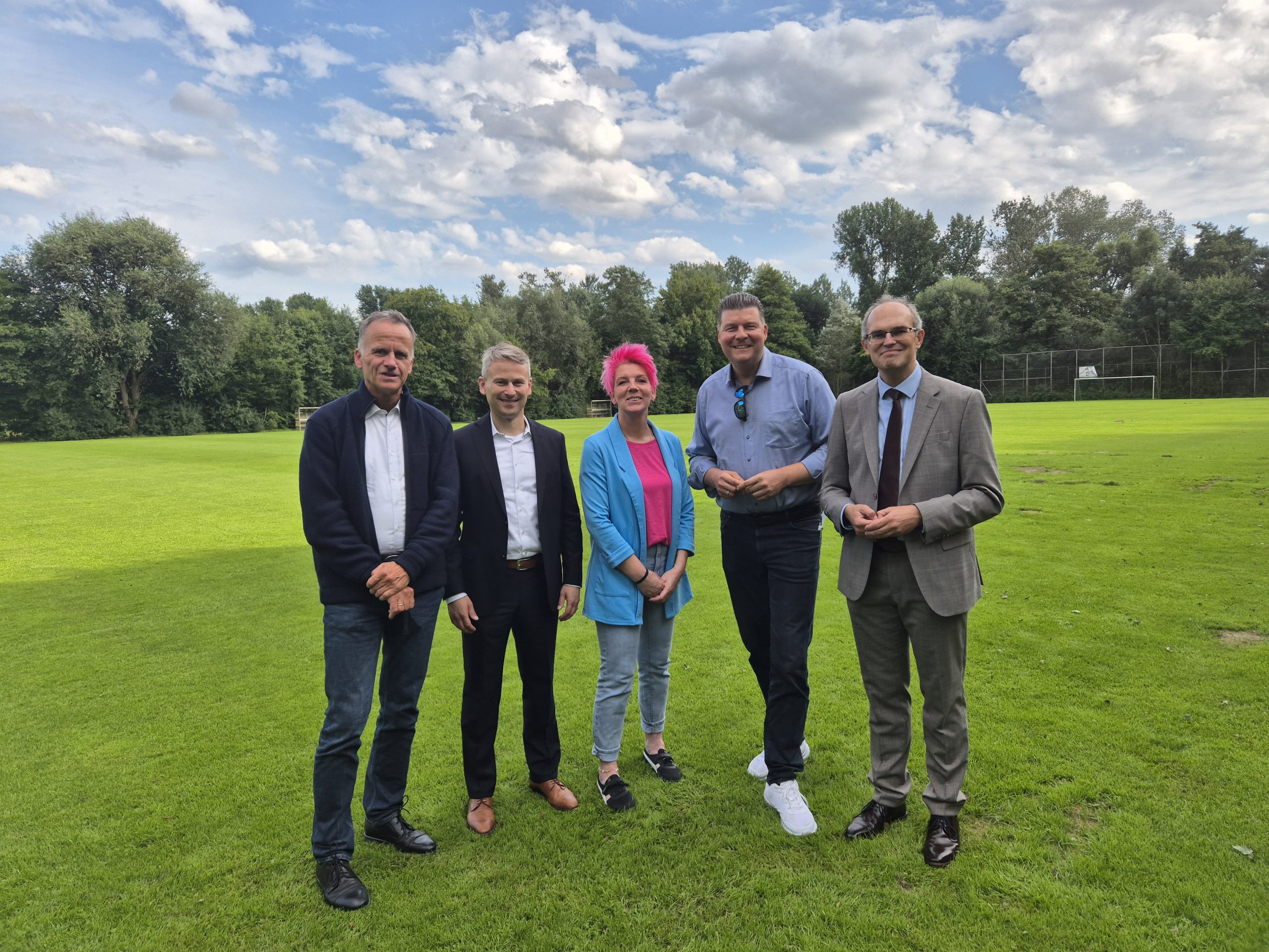 Zum Schluss waren alle mit dem Ergebnis zufrieden: v.l.n.r. Sportstaatsrat Christoph Holstein (SPD) Christian Okun Vorsitzender des Hamburger Fußballverbandes Yvonne Petrich Vorsitzende des Moorburger TSV Finanz- und Bezirkssenator Andreas Dressel (SPD) sowie der neue Leiter des Bezirksamts Harburg Christian Carstensen Foto: au