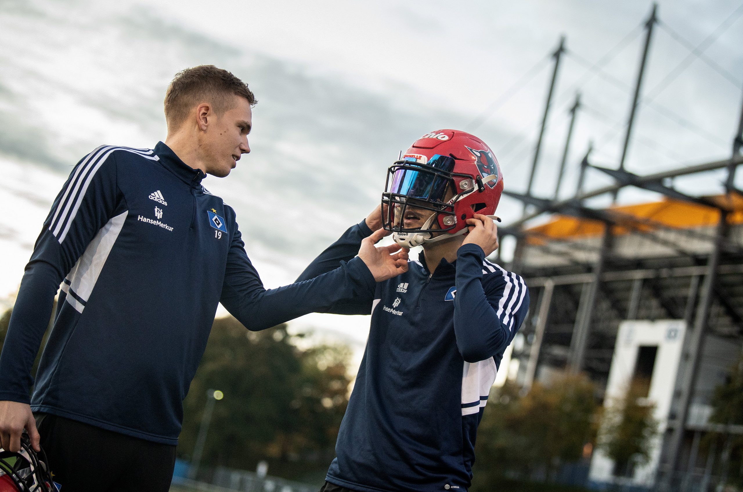 HSV/witters -Matheo Raab und Miro Muheim setzen im Rahmen einer dreiteiligen Football-Challenge (YouTube-Kanal des HSV) einen Helm der Sea Devils auf