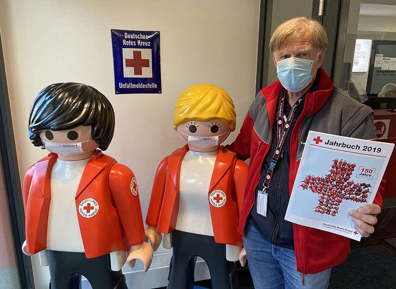 DRK-Kreisverband Hamburg-Harburg e.V. -Mit Maske in guter Gesellschaft: Lothar Bergmann wiedergewählter ehrenamtlicher Präsident des Harburger Roten Kreuzes im Eingang zur DRK-Geschäftsstelle in der Rote-Kreuz-Straße.