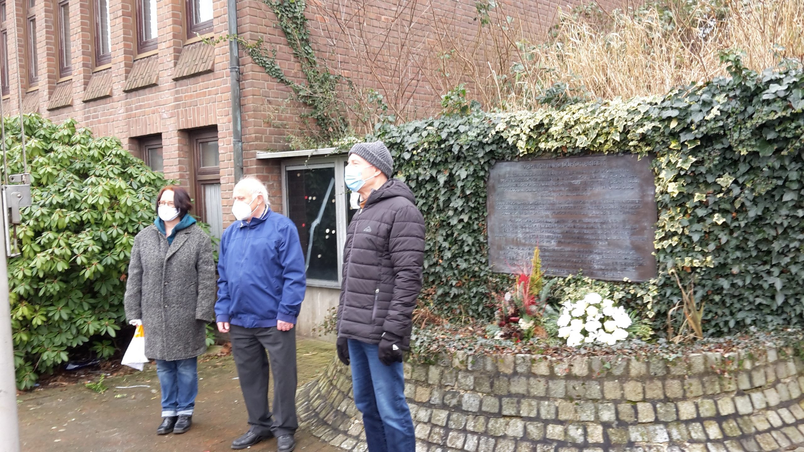 ein -Pastorin Bettina von Thun (Michaelis Gemeinde) Karl-Heinz Schultz (Freundeskreis KZ-Gedenkstätte Neuengamme)und Andreas Winter (Heilig Kreuz Gemeinde) (v.l.n.r.) vor dem Bürgeramt Neugraben ein Gesteck nieder.