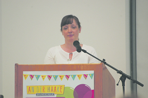 Wolters-Vogeler skizzierte in ihrer Rede den Werdegang der Schule. 50 Jahre wären für eine Schule kein Alter, aber für einen Menschen das halbe Leben. Als kleine Schule Hausbruch geboren, entwickelte sie sich in fünf Jahrzehnten zur GS an der Haake. Diese sei heute eine „bunte und lebendige Schule“, an der Inklusion ernst genommen wird. Team­arbeit wird groß geschrieben, durch die praktizierte gegenseitige Unterstützung im Schulalltag habe man viel erreicht, betonte Wolters-Vogeler. Aber es sei noch nicht alles erreicht. Das nächste Etappenziel stelle den Bau der Kooperationsschule Nymphenweg dar, so die Schulleiterin. Die Schule Nymphenweg – Zweigstelle Hausbruch ist eine Schule mit dem Förderschwerpunkt geistige Entwicklung. Sie ist gemeinsam mit der Grundschule Hausbruch auf einem Gelände untergebracht. Die Schulen kooperieren miteinander.