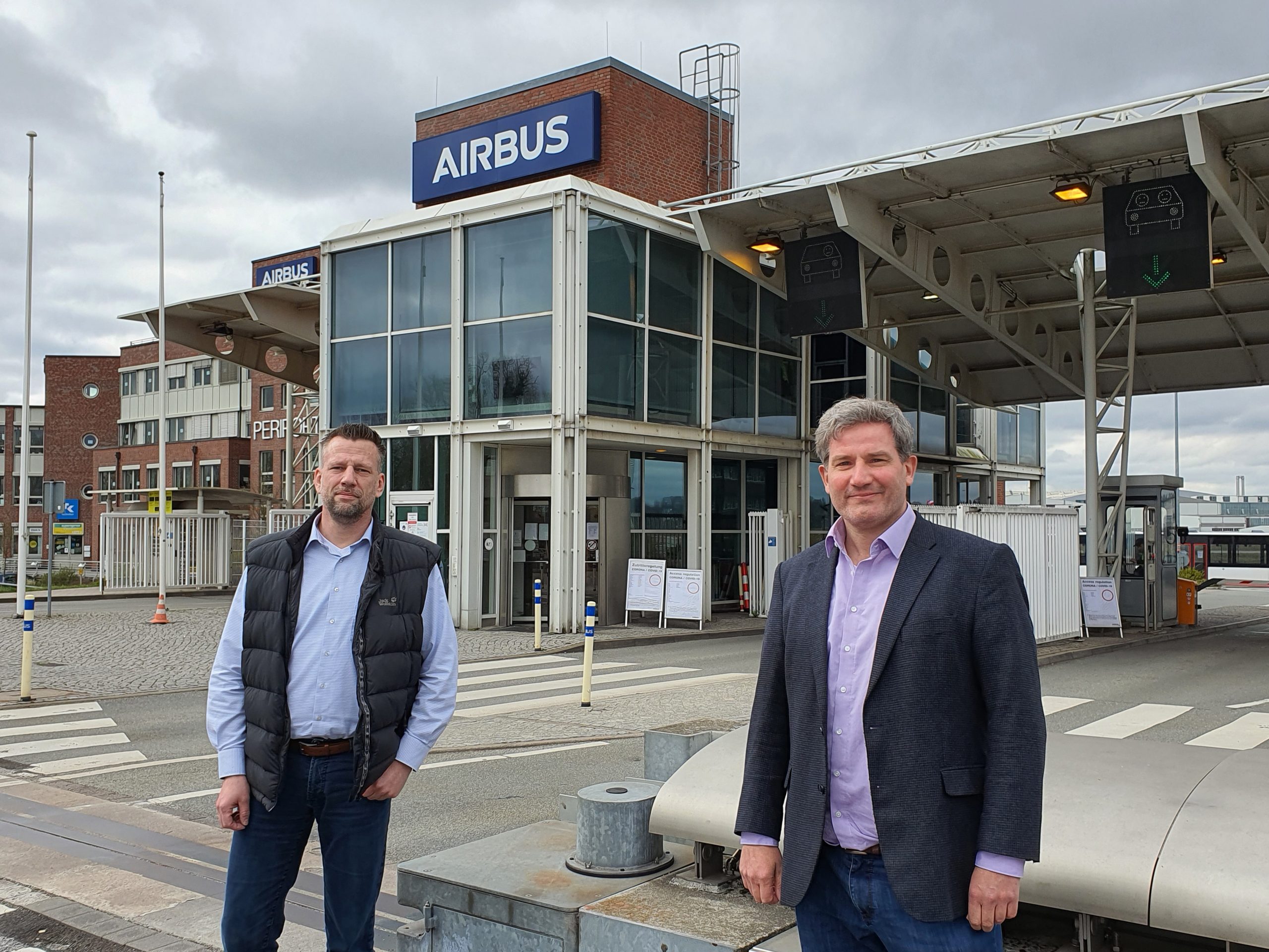 priv. -Metin Hakverdi (re.) vor dem Airbus-Werk zusammen mit Jan-Marcus Hinz Vorsitzender des Konzernbetriebsrates