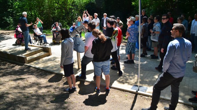 Wer den Harburger Stadtpark vom Nymphenweg aus betritt, entdeckt schon nach wenigen Metern eine neue Station mit drei Fitnessgeräten. Das Besondere daran: Es ist die erste inklusive Bewegungsinsel (IBI) in Hamburg, das bedeutet, hier können Menschen mit und ohne Handicap trainieren. Die drei Sportgeräte wurden so ausgewählt, dass sie barrierefrei vom Rollstuhl aus bedienbar sind. Die Geräte sind sowohl allein als auch zu zweit gleichzeitig nutzbar. Insbesondere die Arm-, Brust-, Schulter- und Rückenmuskulatur kann hier trainiert werden. Mit einem Parcours aus Stufen und Materialwechseln im Bodenbelag werden die Motorik sowie die Bein- und Gesäßmuskeln gestärkt.