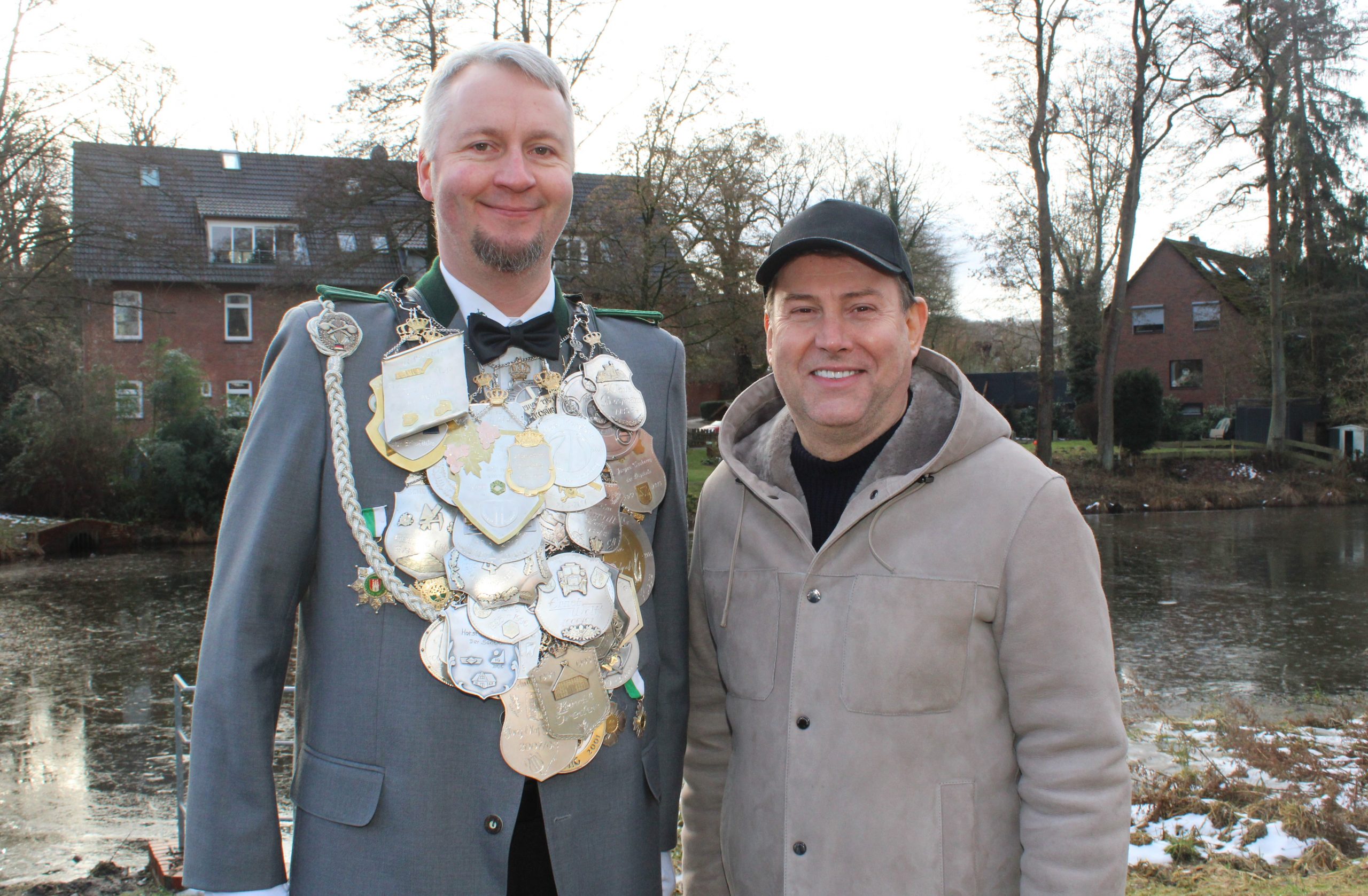Tagesschau-Chefsprecher Jens Riewa (r.) tritt zur Teichwette gegen Marmstorfs Schützenkönig Jochen Meyer an Foto: Tapken Tagesschau-Chefsprecher Jens Riewa (r.) tritt zur Teichwette gegen Marmstorfs Schützenkönig Jochen Meyer an Foto: Tapken