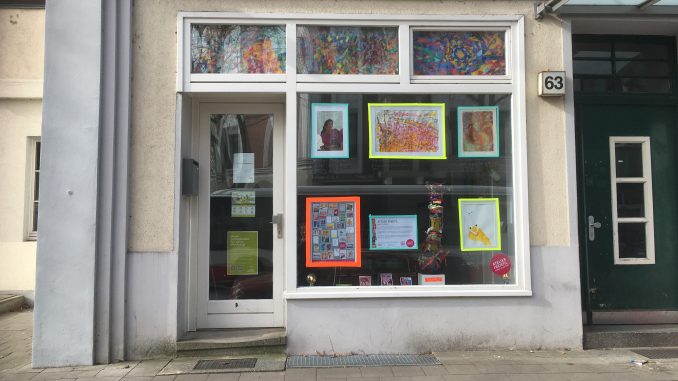 Künstlerinnen und Künstler des Ateliers Freistil haben mit ihren Werken die Schaufensterfront in der Veringstraße 63 gestaltet Foto: ein