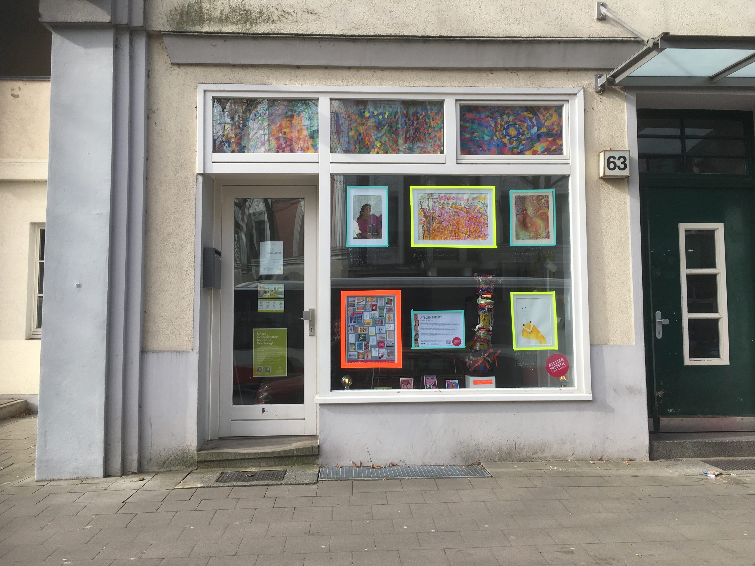Künstlerinnen und Künstler des Ateliers Freistil haben mit ihren Werken die Schaufensterfront in der Veringstraße 63 gestaltet Foto: ein