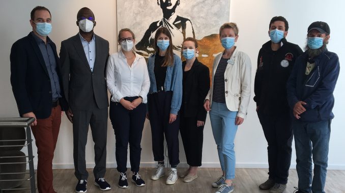 Fachkundig und herzlich führte die Inhaberin die Gruppe aus Gästen und Mitarbeitenden des Harburg-Huus‘ durch die aktuelle Ausstellung „Atowla & Uriel Montúfar“ (noch bis 25. August), die Werke des ivorischen Künstlers Atowla und Fotografien des peruanischen Fotografen Uriel Montúfar präsentiert. Stella Melbye-Konan: „Wir verbrachten einen wundervollen Vormittag zusammen und tauschten Wissen und Fragen über zeitgenössische Kunst und das Management der Galerie aus.“