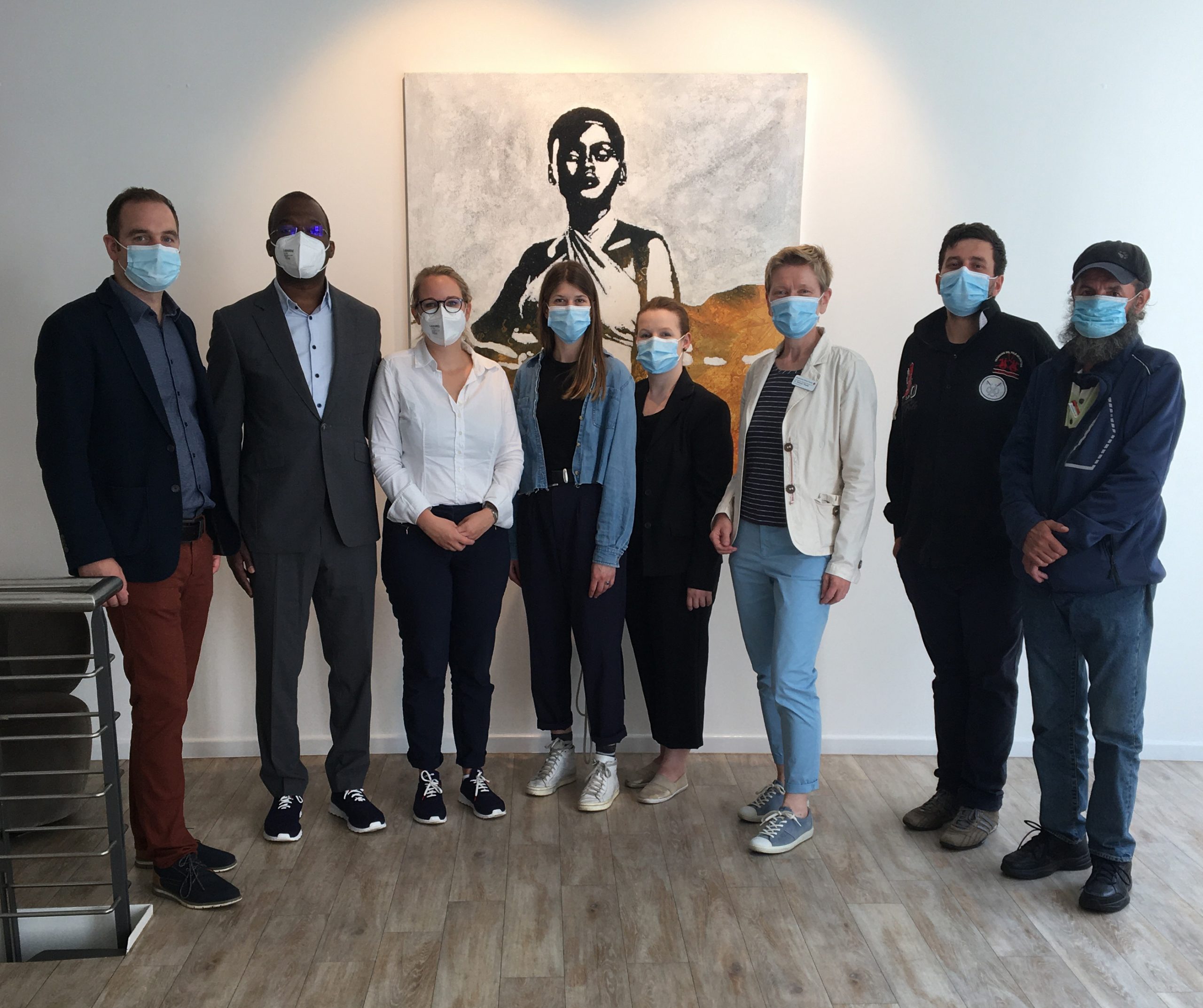 Bildcredit: DRK Harburg -Galeriebesuch am Jungfernstieg: Mitarbeitende und Gäste des Harburg-Huus mit Jean-Cloud Konan und Galeristin Stella Melbye-Konan (2. und 3. v. l.)