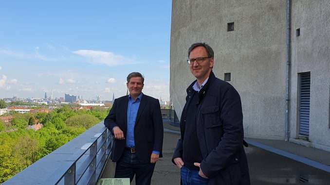 Vom Kriegsmonument zum Ökokraftwerk heißt es auf einem Schaubild, das im Energiebunker in Wilhelmsburg hängt. 1943 wurde der Luftschutzbunker in der Neuhöfer Straße errichtet. Nach dem Zweiten Weltkrieg zerstörten die Alliierten gezielt das Innere des Bunkers. Verschiedene Konzepte für die Weiternutzung des Gebäudes wurden in den Folgejahren nicht realisiert. Im Rahmen der Internationalen Bauausstellung ist es dann zu einem Kraftwerk umgebaut worden. Heute ist das massive Gebäude als Energiebunker bekannt (der Neue RUF berichtete). Der SPD-Bundestagsabgeordnete Metin Hakverdi besuchte vor Kurzem den Energiebunker und informierte sich bei Michael Prinz, Geschäftsführer von Hamburg Energie, über den aktuellen Stand der Erschließung geothermischer Energie für Wilhelmsburg. „Der Energiebunker ist ein Leuchtturm der Energiewende. In ihm werden Energie aus einer Solarthermieanlage auf dem Dach, den Fotovoltaikanlagen, einem Biogas-Blockheizkraftwerk, Industriewärme aus der Nachbarschaft und in Zukunft Geothermie für die Menschen in Wilhelmsburg zur Verfügung gestellt. Solche Anlagen sind normalerweise auf viele Standorte verteilt. Hier sind sie an einem Ort. Aus dem gesamten Bundesgebiet schaut man nach Wilhelmsburg. Wir sind die Blaupause für andere Städte.“