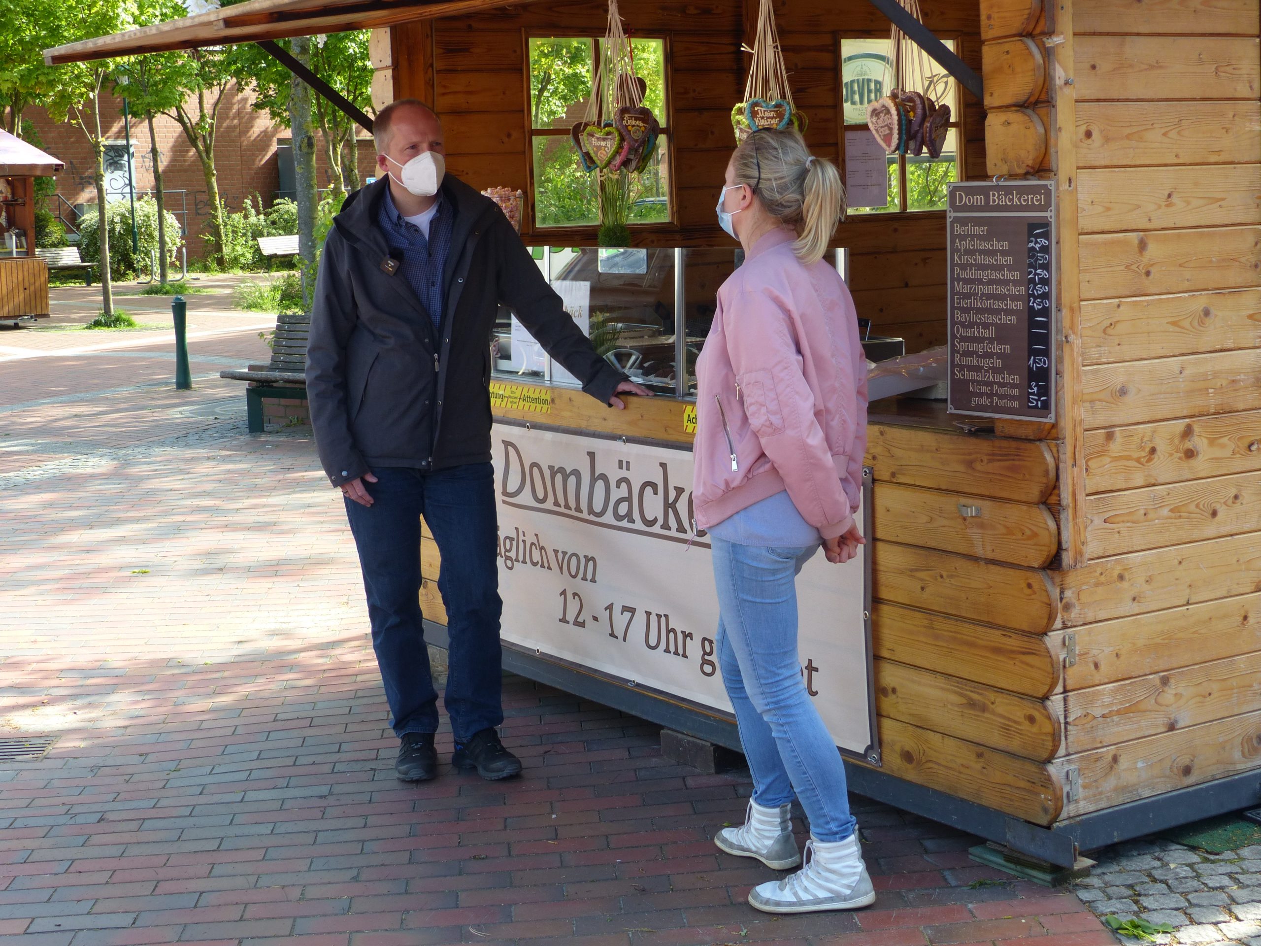 SPD -SPD-Bürgermeisterkandidat Tobias Handtke informierte sich bei der Unternehmerin Janet Marx über die Auswirkungen der Corona-Krise