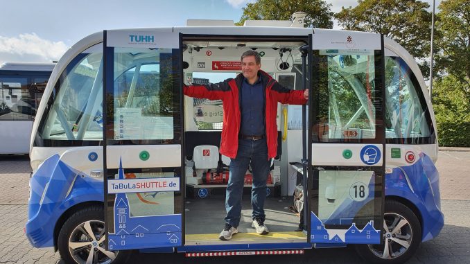 Der Einstieg in den TaBuLa Shuttle in Lauenburg ist ein Einstieg in die Zukunft. Die Fahrgäste gehen nicht am Fahrer vorbei. Ein Lenkrad gibt es nicht. Damit gibt es im Fahrzeug auch kein Vorne oder Hinten mehr. Der TaBuLa Schuttle ist ein Gemeinschaftsforschungsprojekt von TUHH und dem Kreis Herzogtum-Lauenburg. Erforscht wird das autonome Fahren und die Mobilität der Zukunft. Metin Hakverdi (SPD), für Harburg und Süderlebe im Deutschen Bundestag, besuchte das Forschungsprojekt vor Ort. Hakverdi: „Das war meine erste Fahrt mit einem Fahrzeug ohne Lenkrad. Am Anfang habe ich mit dem Fahrzeug gefremdelt. Nach einer Weile gewöhnt man sich daran, dass man von einem Computer gefahren wird. Man bleibt aber aufmerksam und beobachtet, ob dem Fahrzeug die erforderlichen Manöver ohne Menschenhand gelingen.“