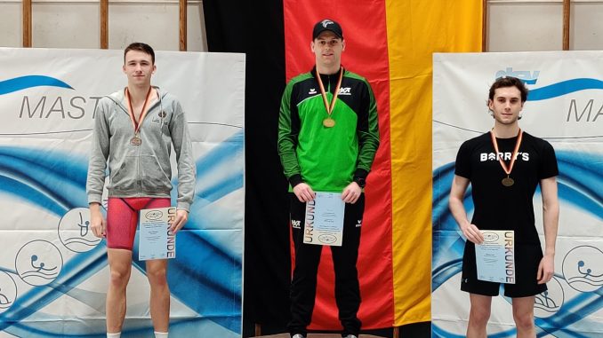 Nach langer Pandemie-Pause waren die Mastersschwimmer der Hausbruch-Neugrabener Turnerschaft (HNT) im März wieder erfolgreich im Becken unterwegs. Für den Glanzpunkt sorgte Erik Brügge bei den 36. Deutschen Mastersmeisterschaften auf der langen Strecke vom 18. bis 20. März in Solingen. In der AK25 schwamm der 28-Jährige über 200 m Schmetterling in 2:26,00 Minuten zum Deutschen Meistertitel. Über die 200 m Rücken wurde er in neuer persönlicher Bestzeit von 2:25,19 Minuten Vizemeister.