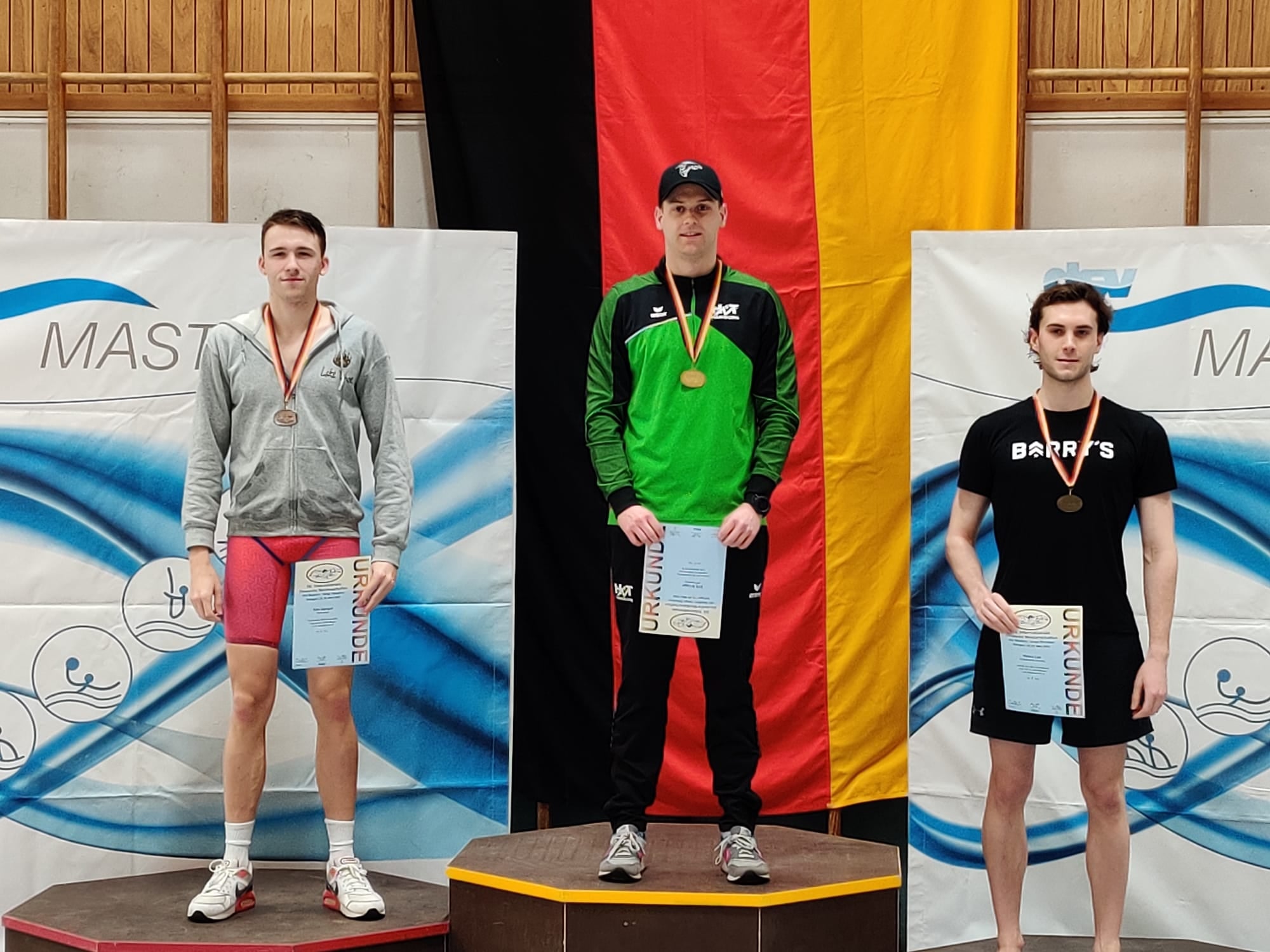HNT/privat -Erik Brügge (m.) bei der Siegerehrung für 200 m Schmetterling bei den Deutschen Mastersmeisterschaften