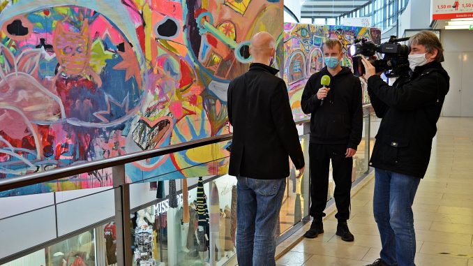 Thematisch beschäftigen sich die jeweiligen Werke mit den Plätzen, auf denen sie entstanden sind. Herbert Wehner raucht seine Pfeife, der Phönix fliegt durch’s Viertel, die Außenmühle tropft, das Rathaus glüht und der Binnenhafen schwappt ins Bild. Über die sechs Aktionstage waren sehr viele Harburger an den Mal-Prozessen beteiligt. Und somit wurde beschlossen, einen Ausstellungsort für die entstandenen Werke zu finden. Dank Centermanagerin Melanie Wittka, der Leitung des Center-Managements der Harburg Arcaden, und mit freundlicher Unterstützung sowie Förderung der lokalen Partnerschaften für Demokratie Harburg des Bezirksamts Harburgs, hängen die Werke nun seit dem 5. Oktober und noch bis zum 14. November sehr prominent in den Harburg Arcaden. Sie setzen ein Zeichen für den kreativen Umgang mit Krisen-Situationen und stehen gleichzeitig für die Vielfalt und Gemeinschaft Harburgs ein.