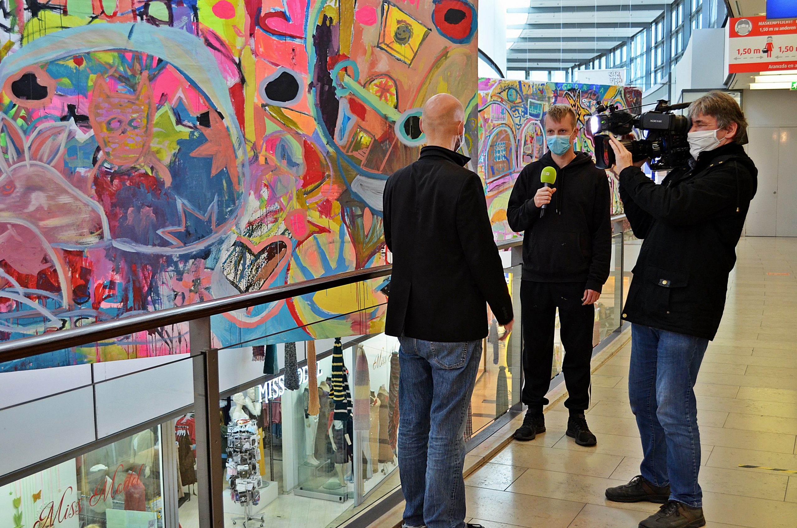 gd -In einem TV-Interview stellt Marius Thieme (Mitte) Projektleiter des Kulturwohnzimmers e.V. den Hintergrund der Aktion heraus