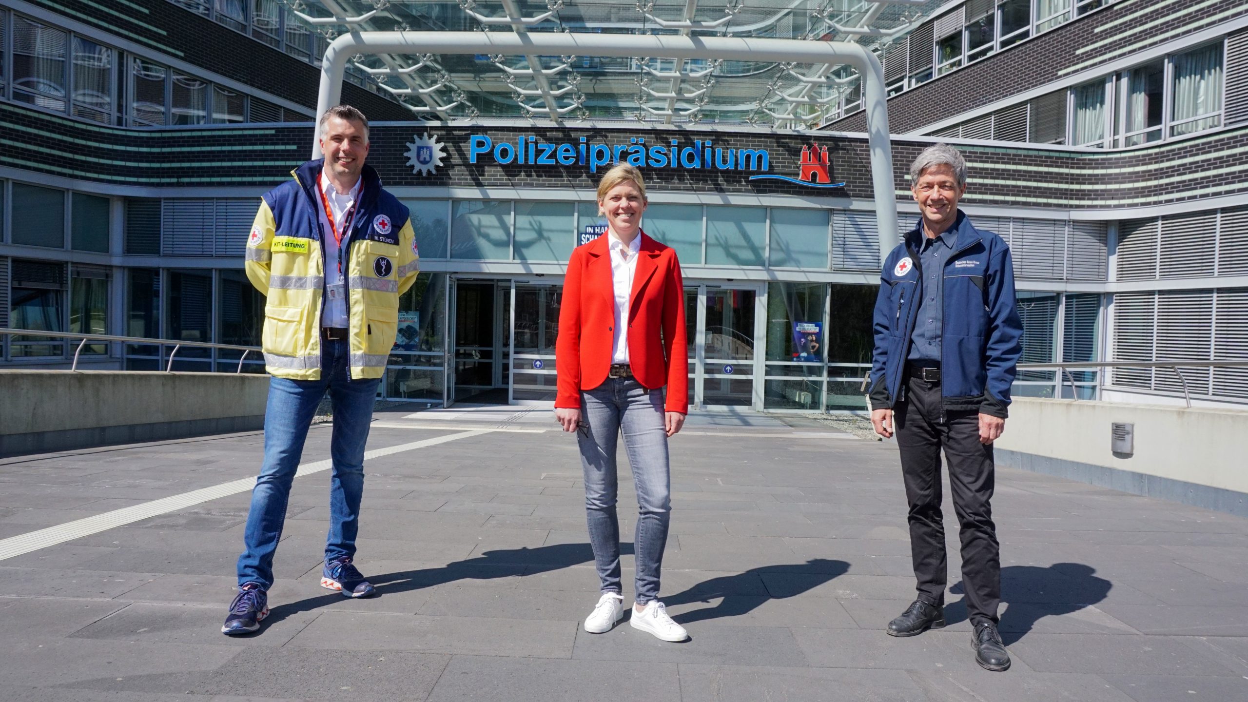Foto: Polizei Hamburg -Enge Kooperation unter Beachtung von Distanzregeln: Malte Stüben (links) und Olav Meyer-Sievers vom DRK-Kriseninterventionsteam mit Sandra Levgrün Pressesprecherin der Polizei Hamburg