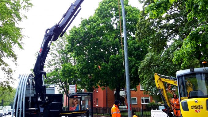 Seit Tagen werden trotz widriger Wetterverhältnisse in der Neugrabener Bahnhofstraße im Abschnitt Sparkasse Harburg-Buxtehuder bis zur Einmündung in die Cuxhavener Straße die Beleuchtungs-Masten altersbedingt erneuert. Die Modernisierung sollte bis zum Anfang des Wochenendes abgeschlossen sein.